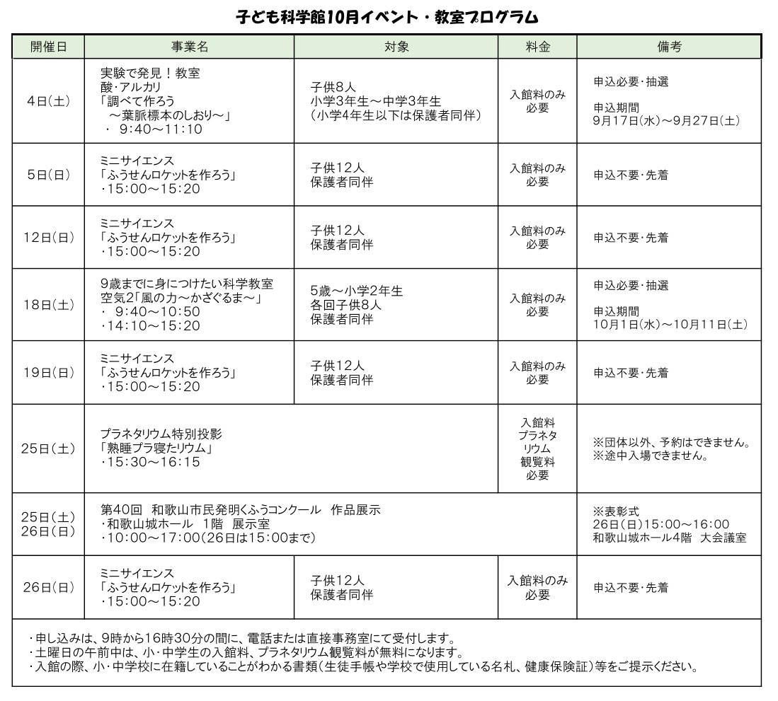 こども科学館10月のイベント・教室