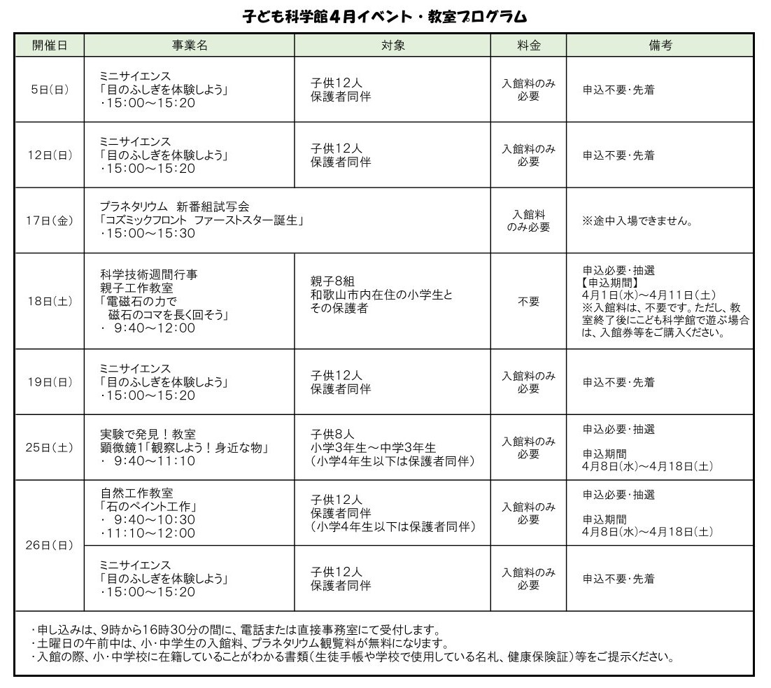 こども科学館4月のイベント・教室