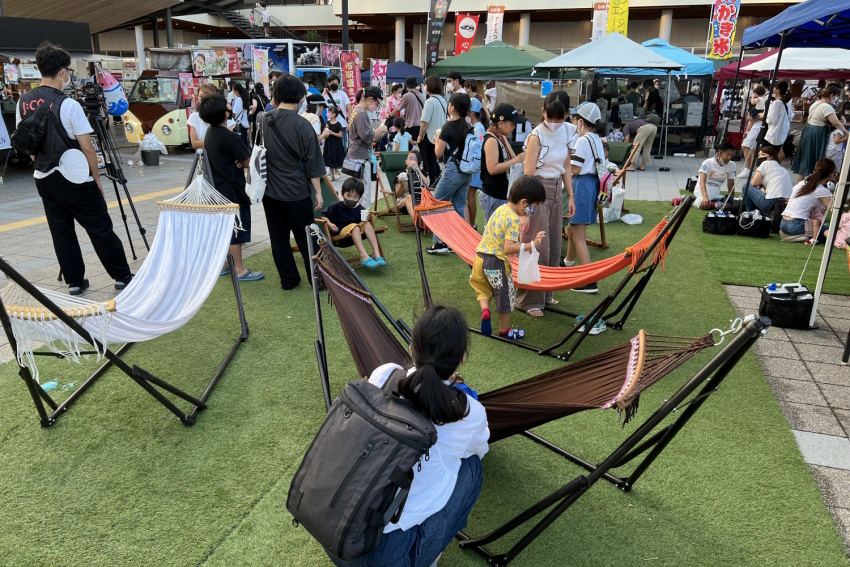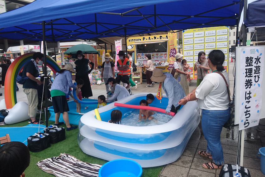 また第二会場となった市駅前広場では、午前10時からキッチンカーや出店エリアとともに、ハンモックの並ぶ芝生広場の隣には子どもたちが水遊びを楽しめるプールを設置し、親子連れを中心に多くの方々にお越しいただきました。