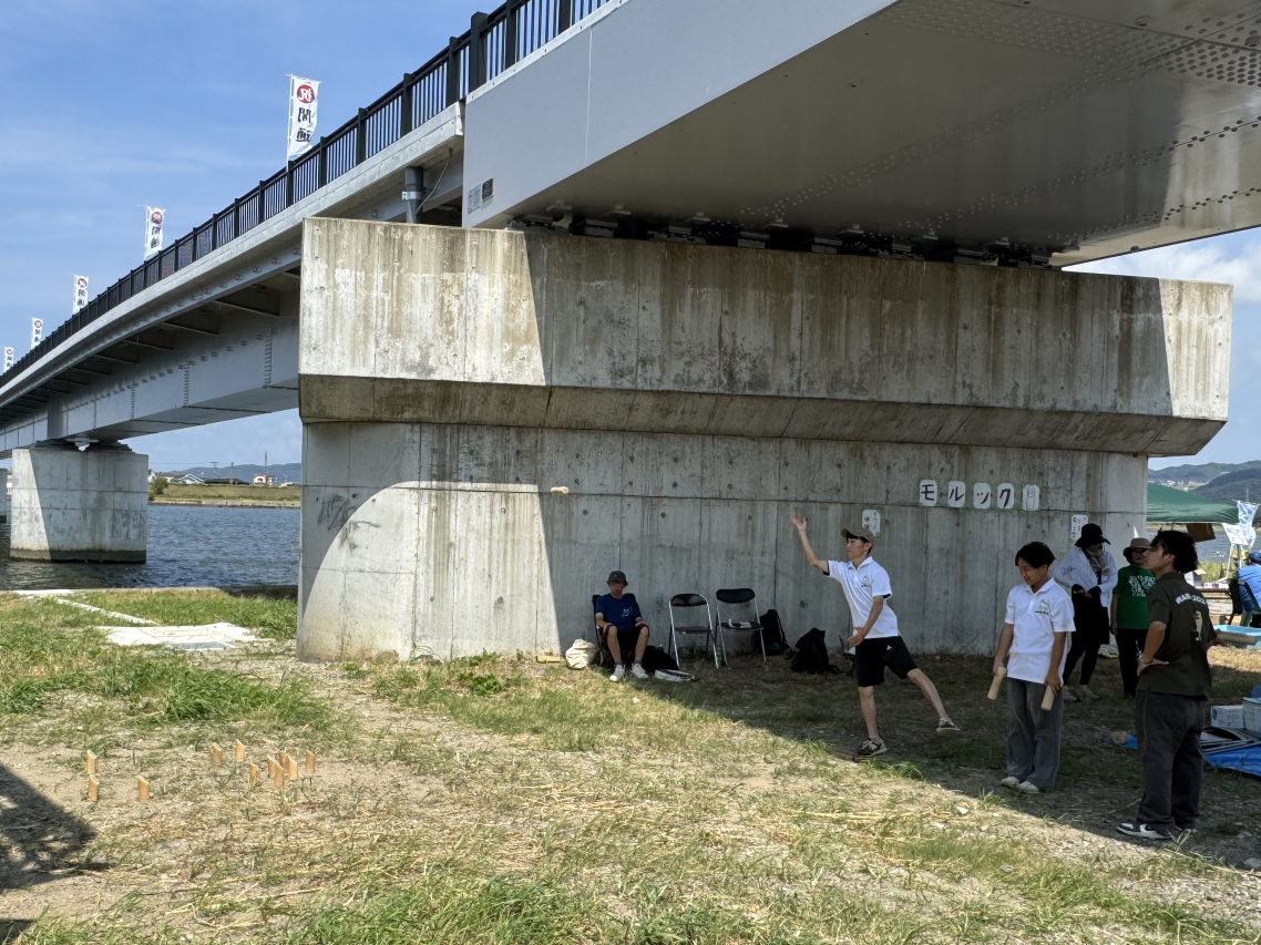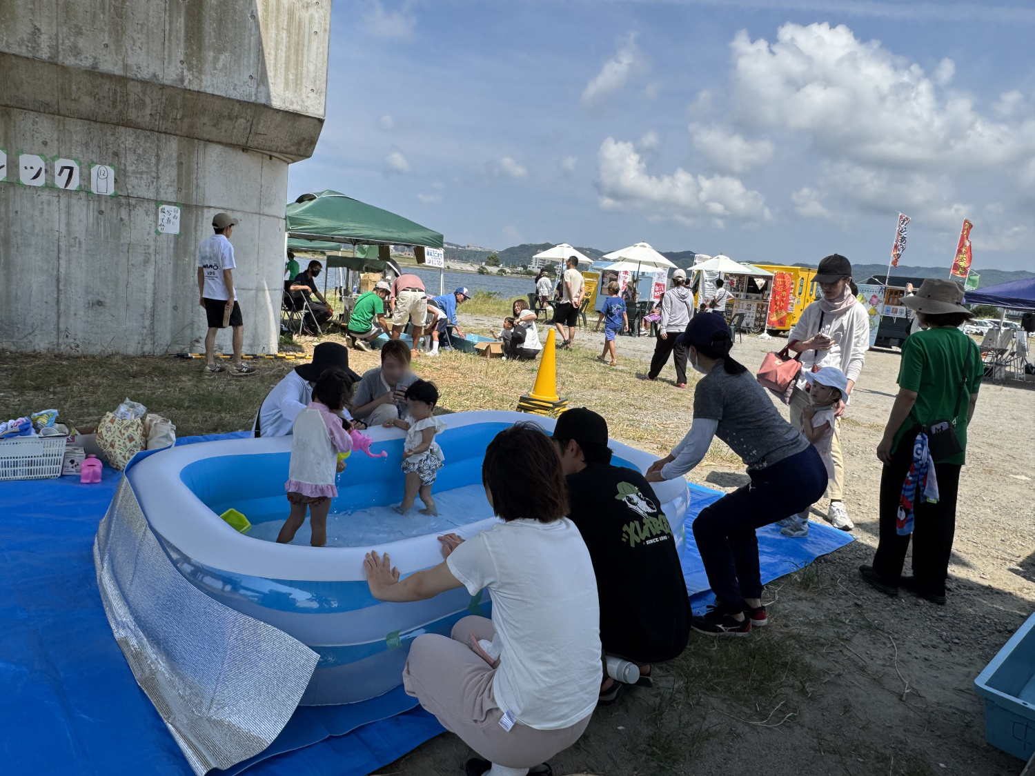 会場内では、事前予約制のBBQや、キッチンカー等による飲食物の販売、紀の川の歴史や河川改修に関するパネル展示を行ったほか、遊び体験として、モルックやコーンホール、プールでの水遊び、輪投げやスーパーボールすくい、千本釣り、さらに冒険シャボン玉研究所の協力による巨大シャボン玉のパフォーマンスと遊び体験も行いました。