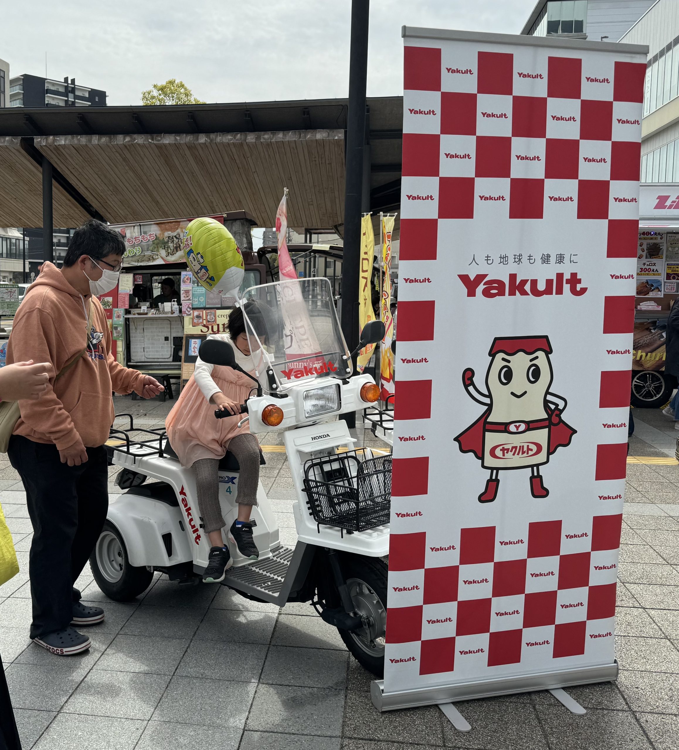 6日は「交通安全」をテーマに、警察車両のパトカー・白バイ・機動隊ジムニー、サインカー等に加え、レッカー車、TOYOTAプリウス・C⁺walk・WHILL、ヤクルトお届け車両タント・ジャイロも展示されました。パトカー、白バイなどの制服着用・乗車体験、ヤクルトレディの子ども制服着用・乗車体験、マスコットキャラクター「きしゅう君」や「ヤクルトマン」との撮影会も行われました。午後には「和歌山県警察音楽隊」による演奏も加わり、大勢のお客様で賑わいました。