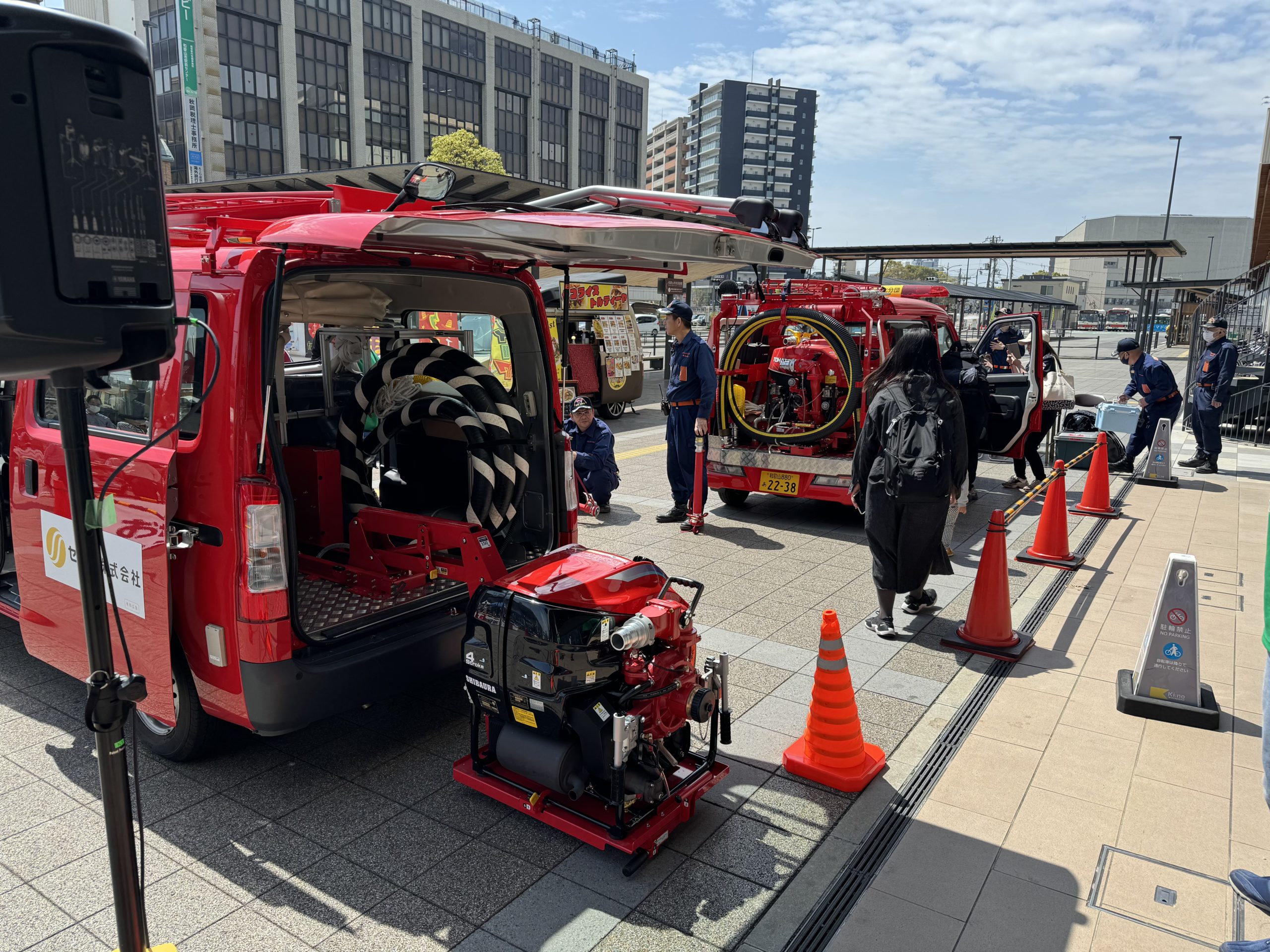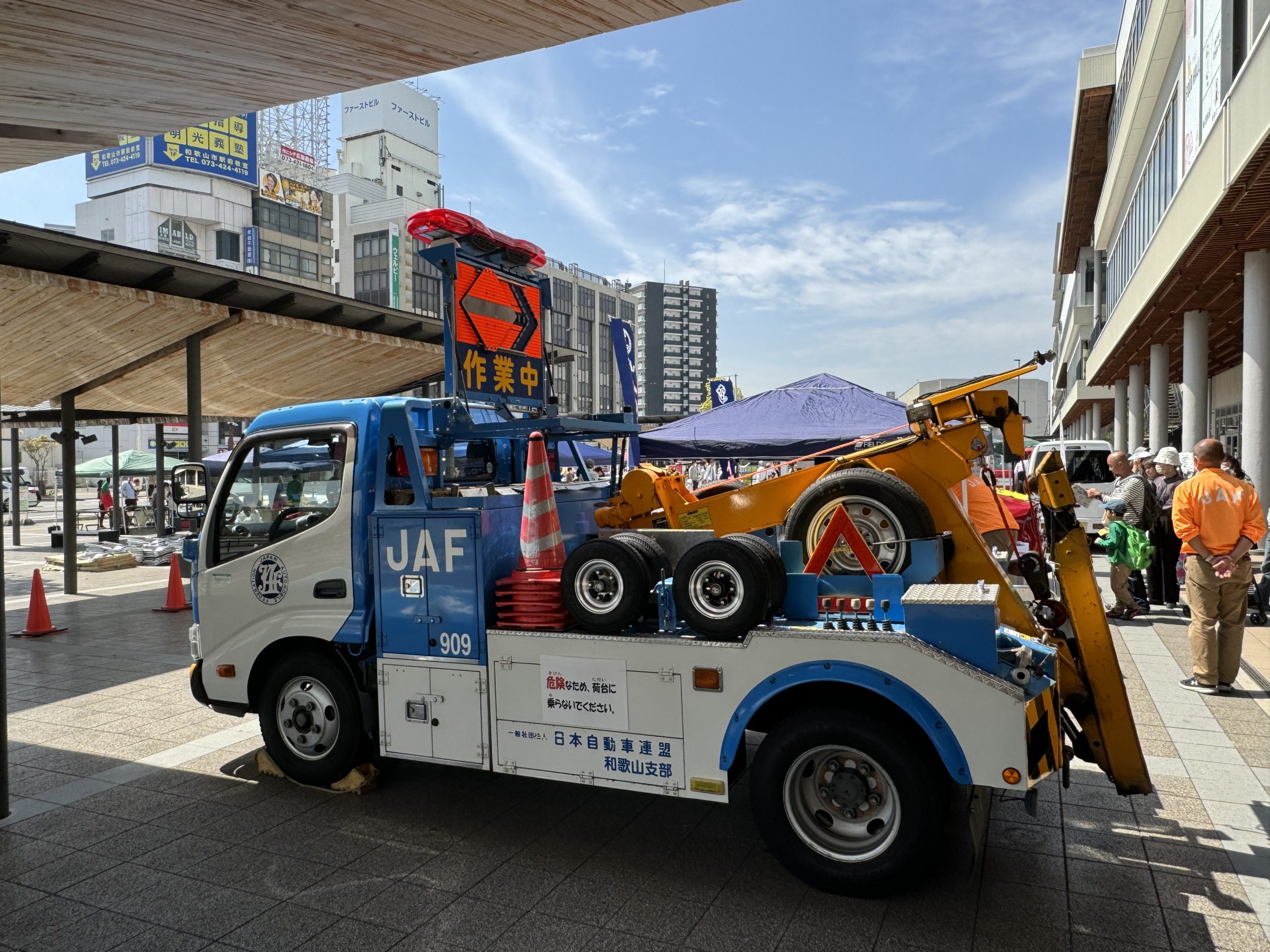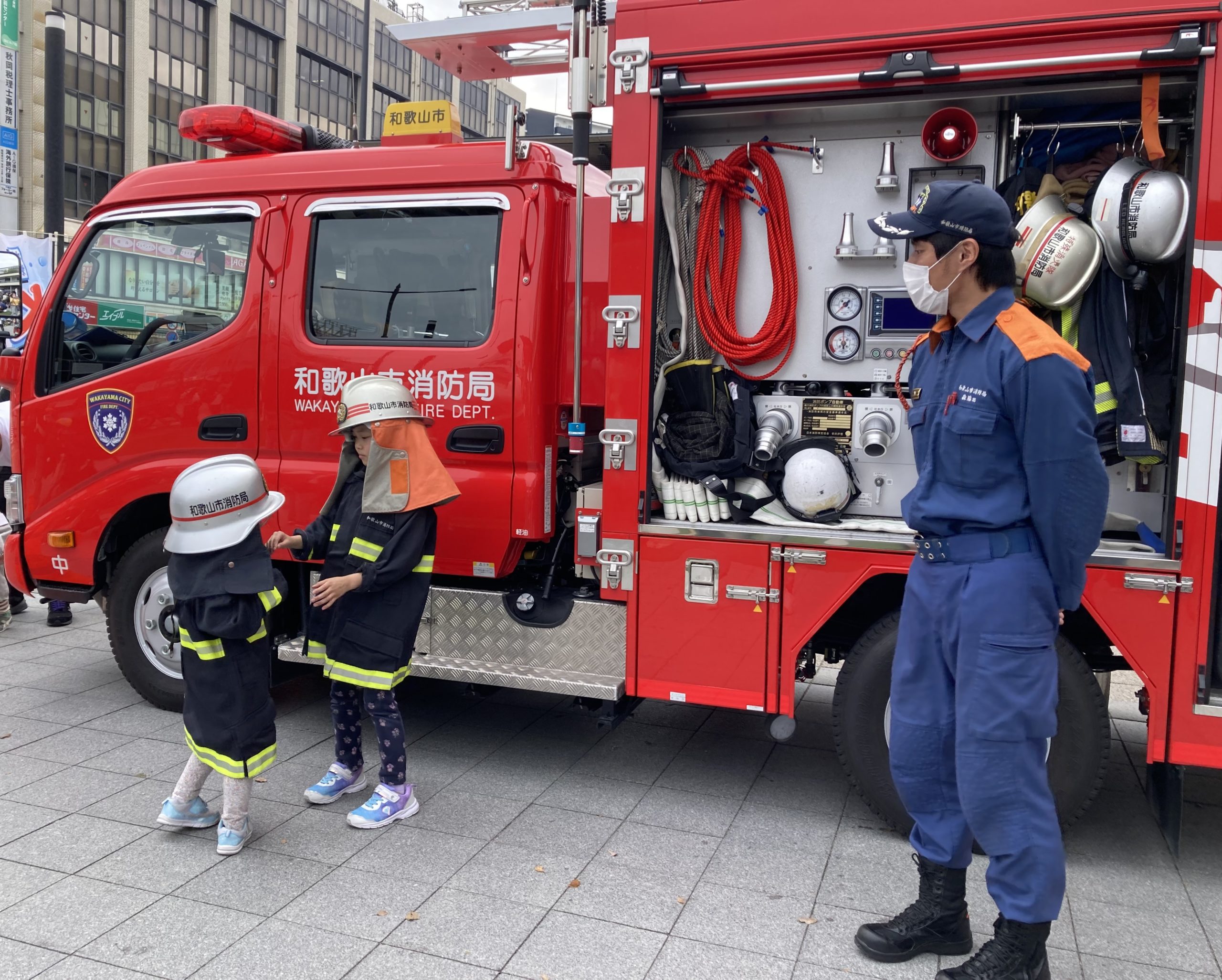 7日は「防火、防災」をテーマに、消防署の消防ポンプ車とVR防災体験車、地域の消防団の消防ポンプ車のほか、TOYOTAプリウス・C+walk・WHILL・レッカー車などが展示され、消防の子ども防火服の着用・乗車体験、マスコットキャラクター「和びっとちゃん」との撮影会も行われました。午後には「和歌山市消防音楽隊」による演奏と楽しい火の用心の劇も加わり、会場を盛り上げました。