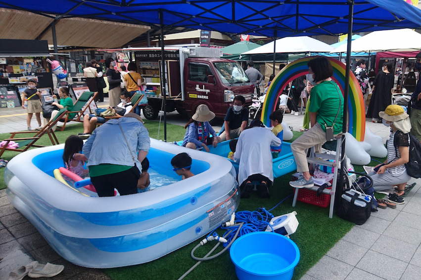 また第二会場となった市駅前広場では、午前10時からキッチンカーや出店エリアとともに、ハンモックの並ぶ芝生広場の隣には子どもたちが水遊びを楽しめるプールを設置し、親子連れを中心に多くの方々にお越しいただきました。
