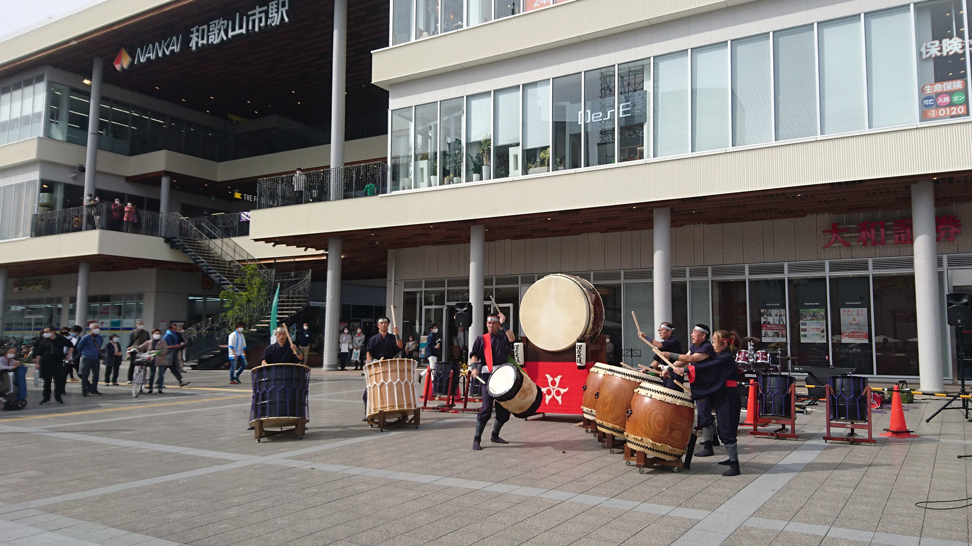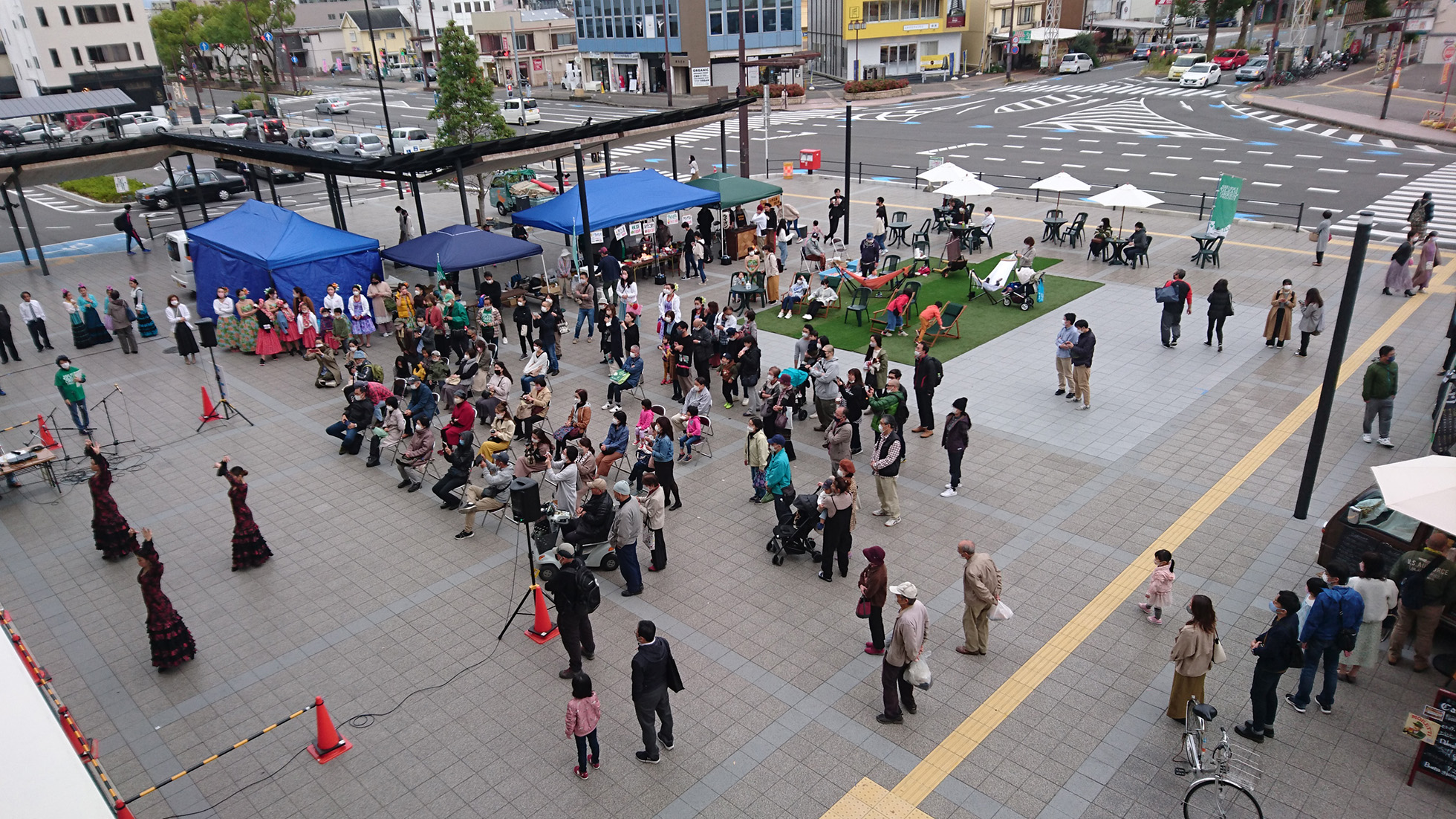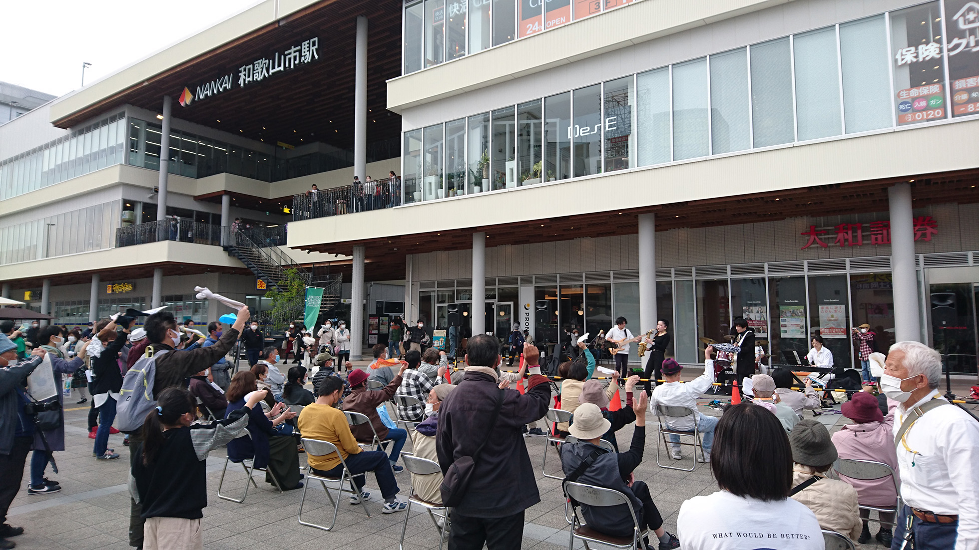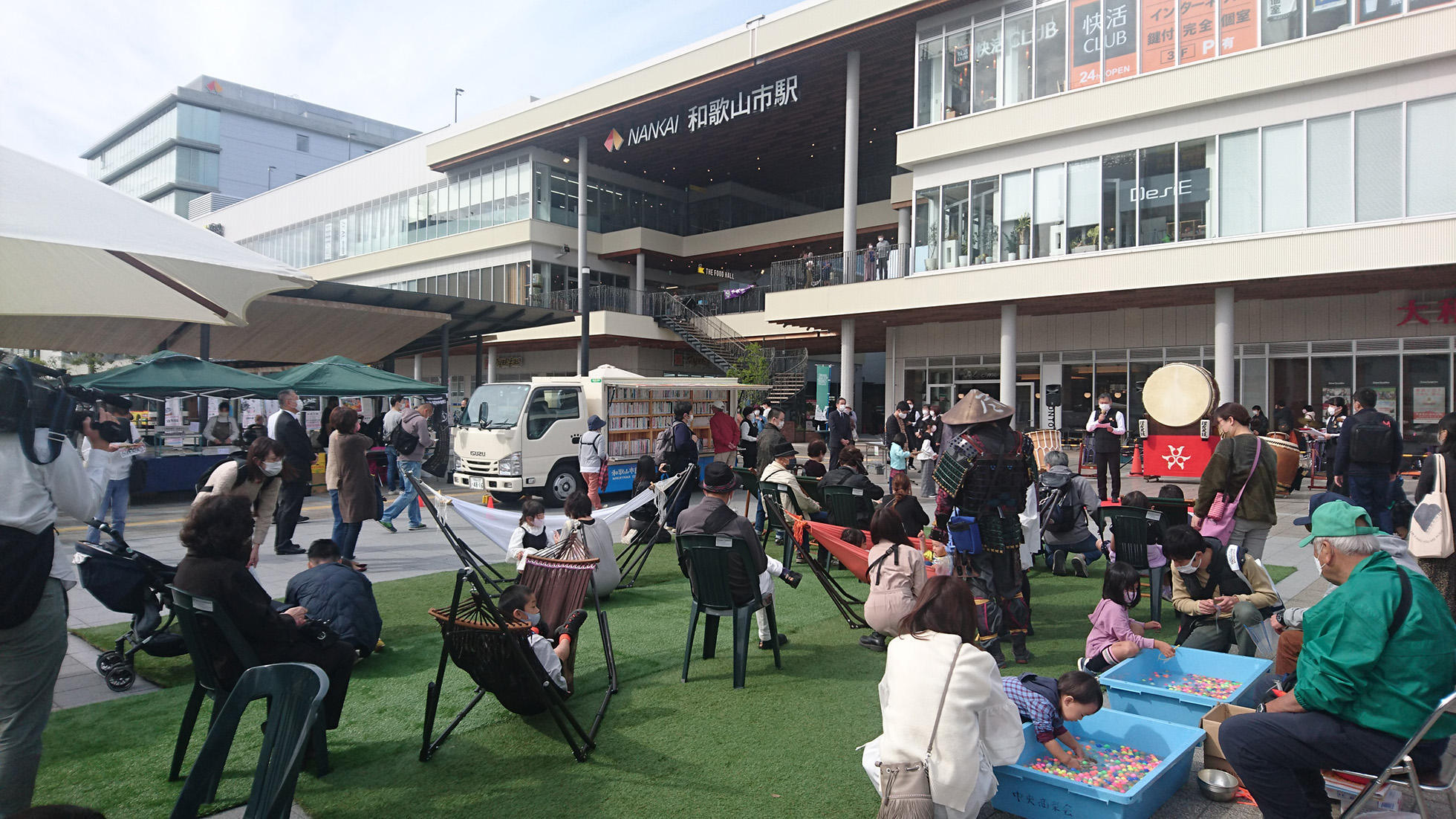 11月6日(土)に和歌山市駅前広場の賑わいづくりイベント「しえきのいま 2021秋 〜音〜」を開催しました。本年10/30〜11/21に開催された紀の国わかやま文化祭の応援事業として企画したもので、和歌山市ゆかりのアーティストや団体による音楽・舞踊などのステージを中心に、芝生の上にハンモックやデッキチェアを置いたピクニック広場を設け、周囲にはフードやドリンクの出店ブースが並びました。また冒頭では和歌山市民図書館の新しい移動図書館車「ほんわか号」も公開され、命名式が行われました。お天気にも恵まれ、小さなお子さま連れから年配の方々まで延べ1000人以上の方々にお越しいただき、無事に終了することができました。ご来場いただいた皆様、関係者の皆様ありがとうございました。