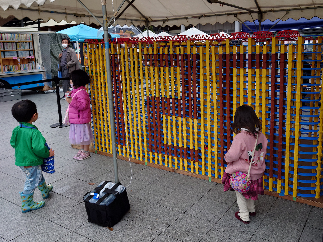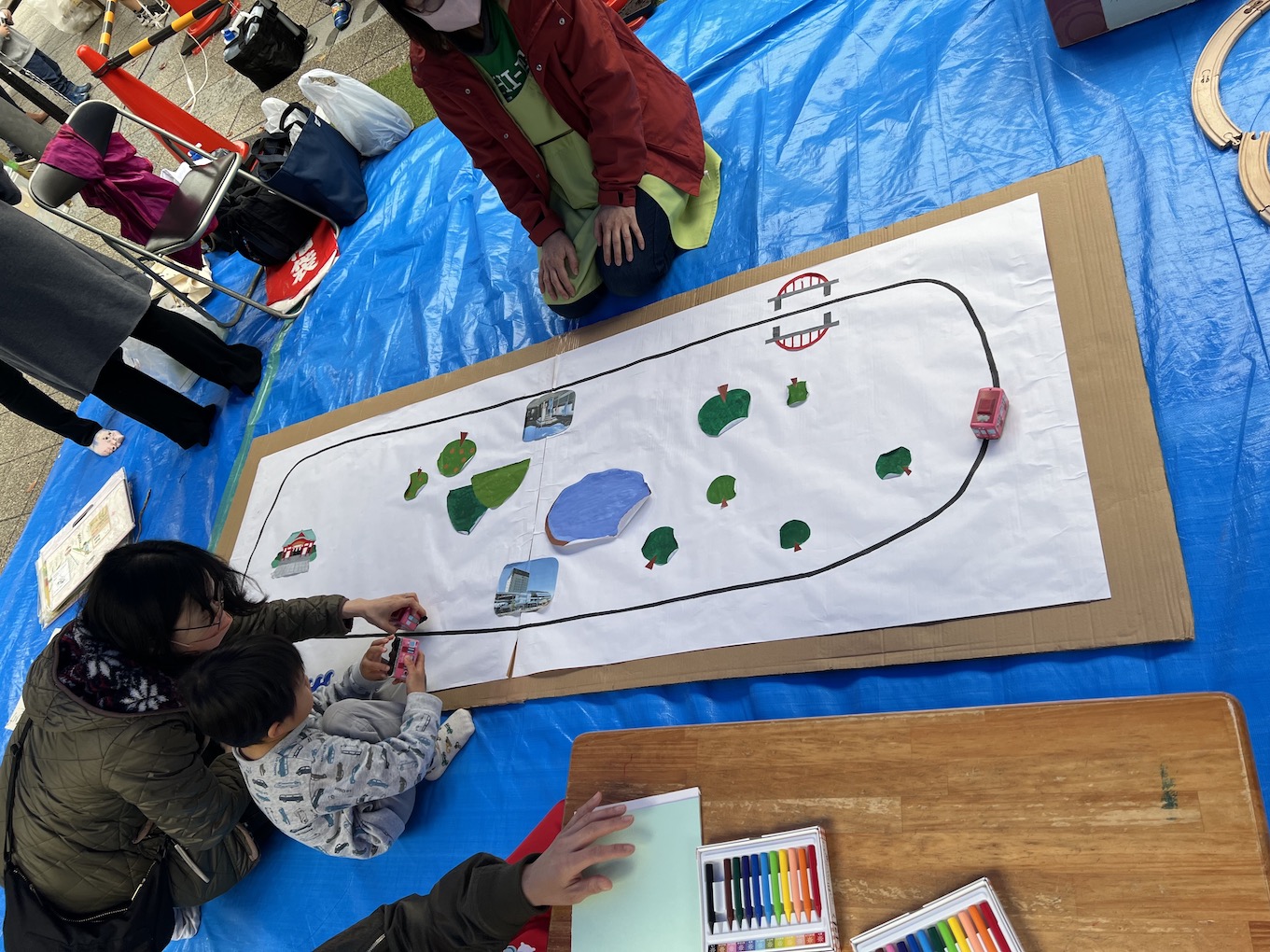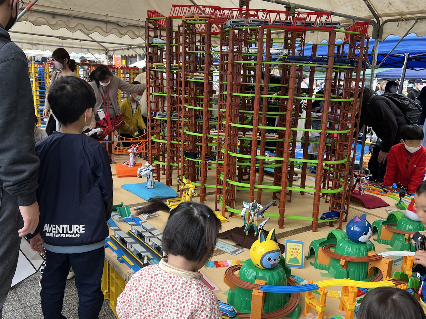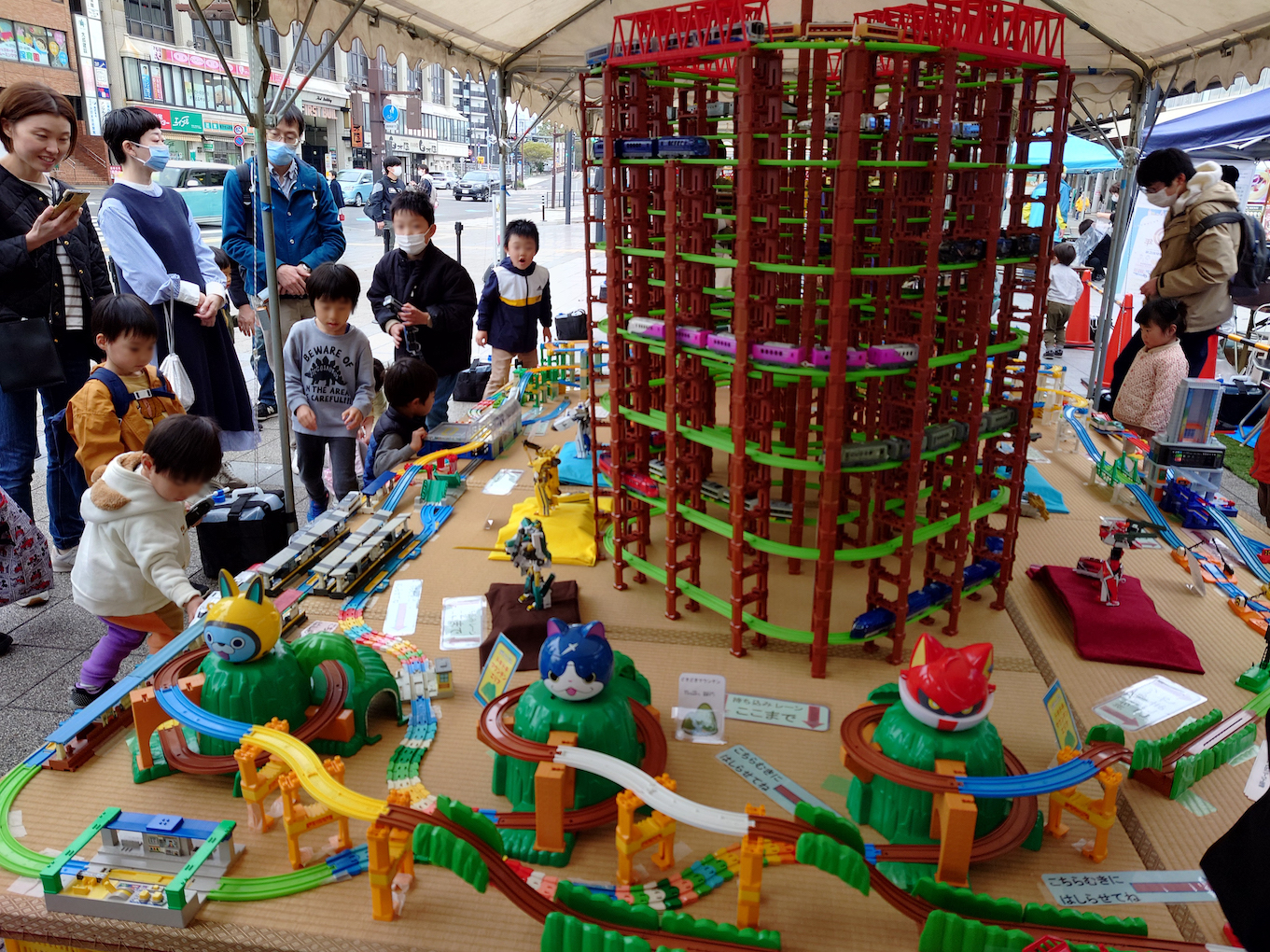 当日は小雨に見舞われましたが、メイン会場の市駅前広場では、電車のおもちゃで自由に遊べる「トイレール広場」を設置し、ご家庭から持ち込んだプラレール車両を走らせられる大型レイアウトや、小さなお子さまも遊べるスペースも設け、開始当初から大勢の親子連れで賑わいました(走行用レイアウトの延べ入場者数は543人)。
