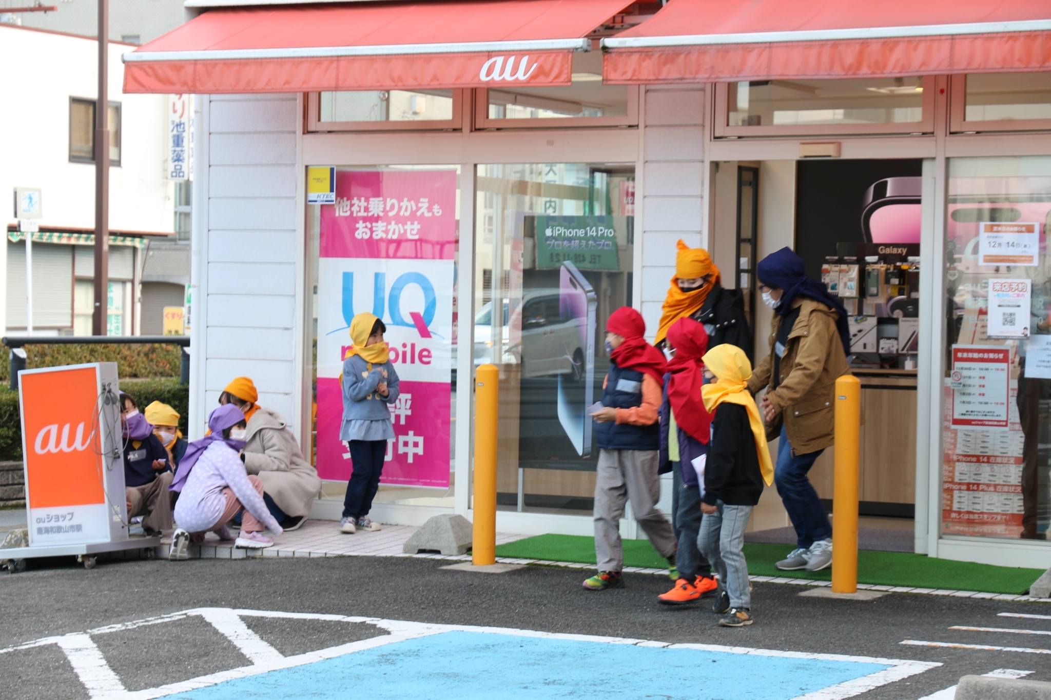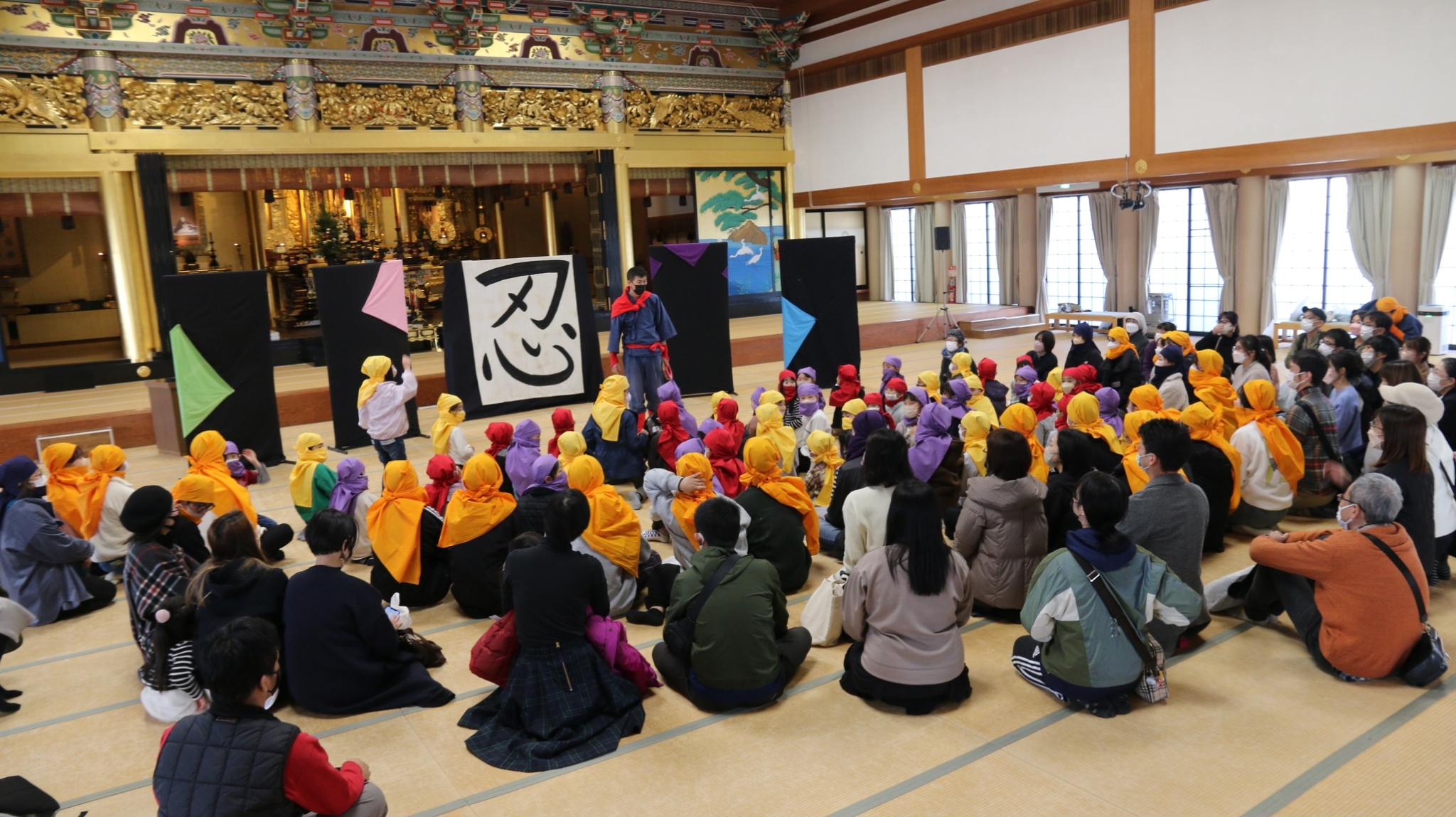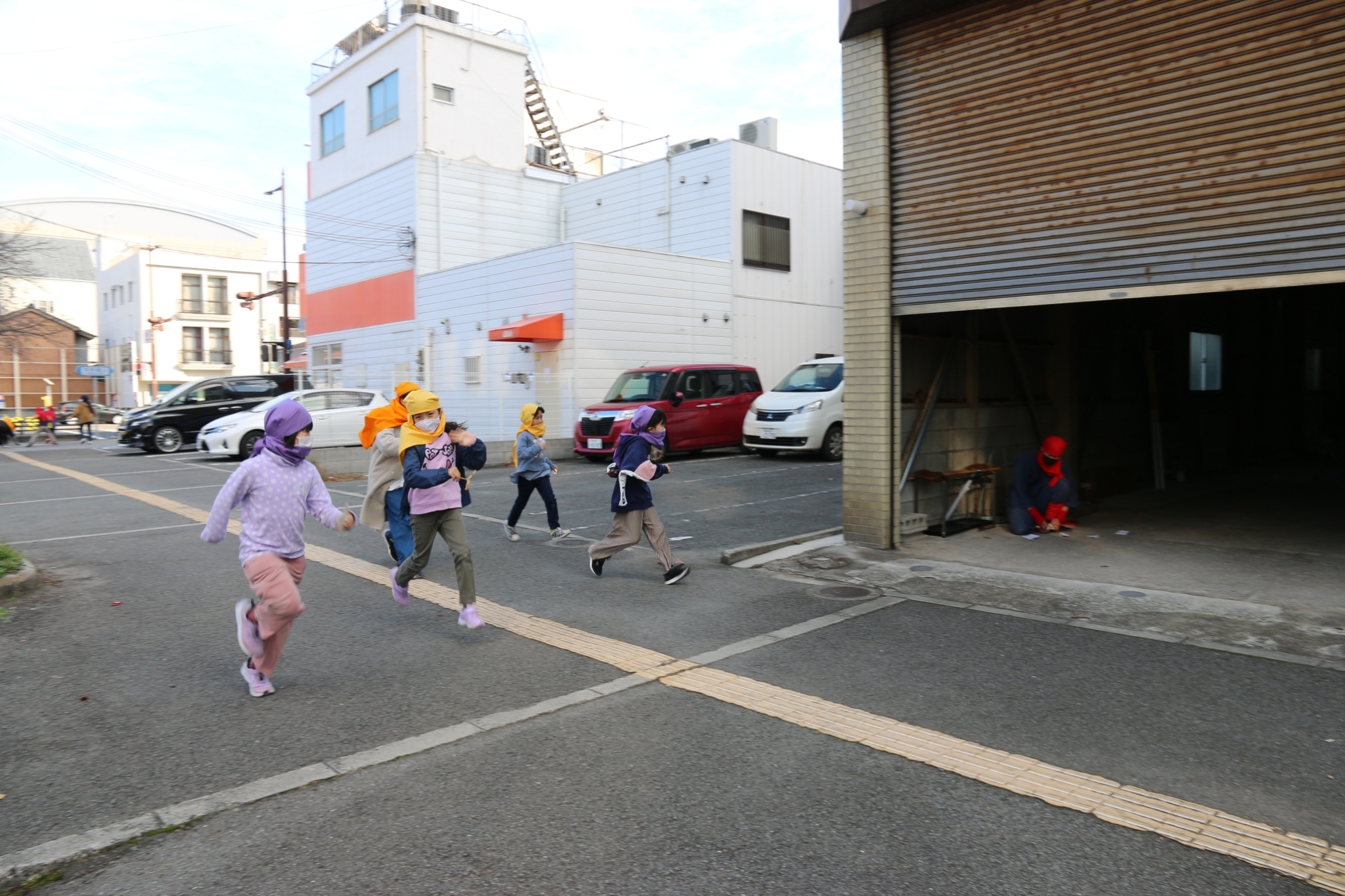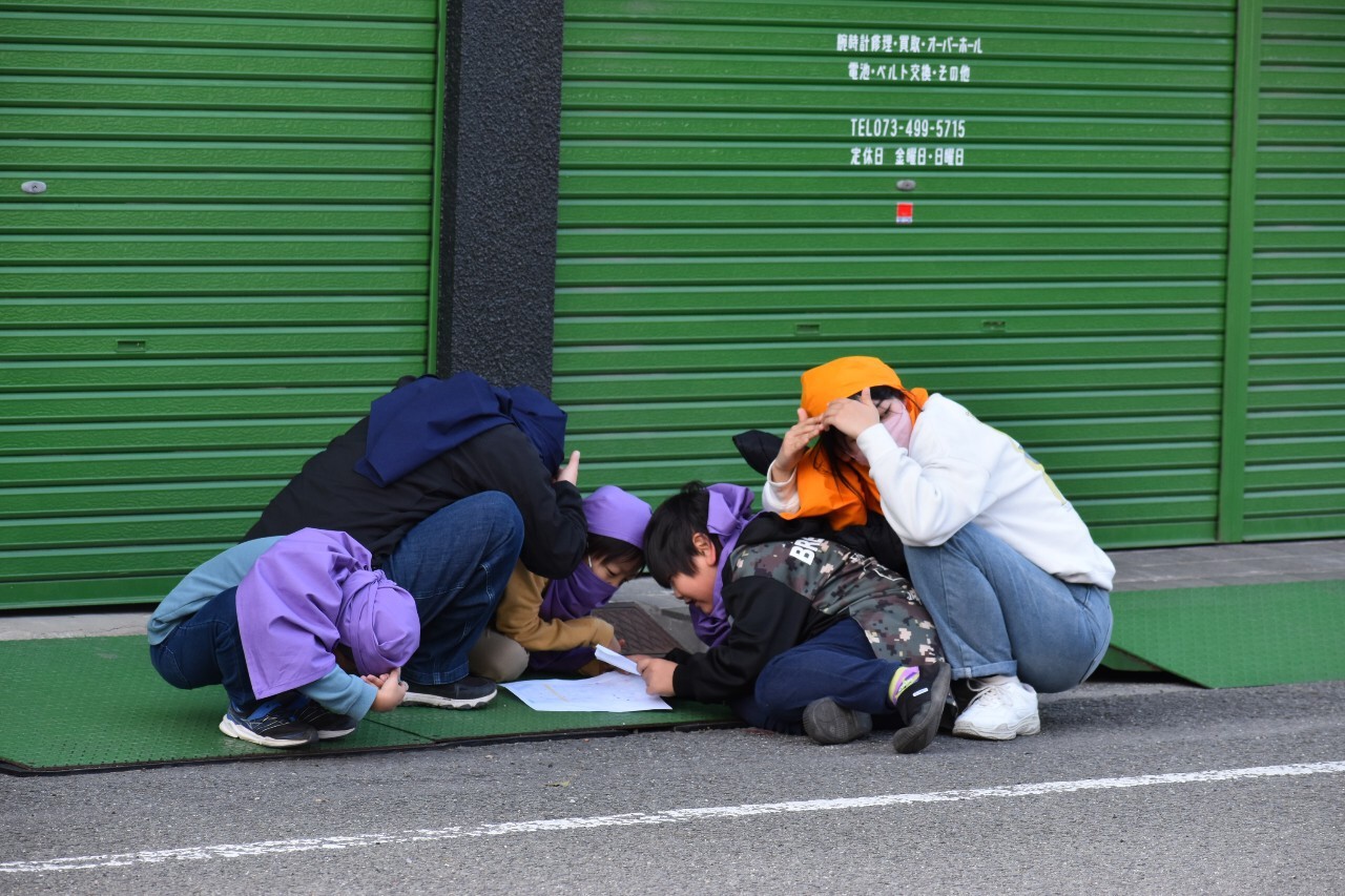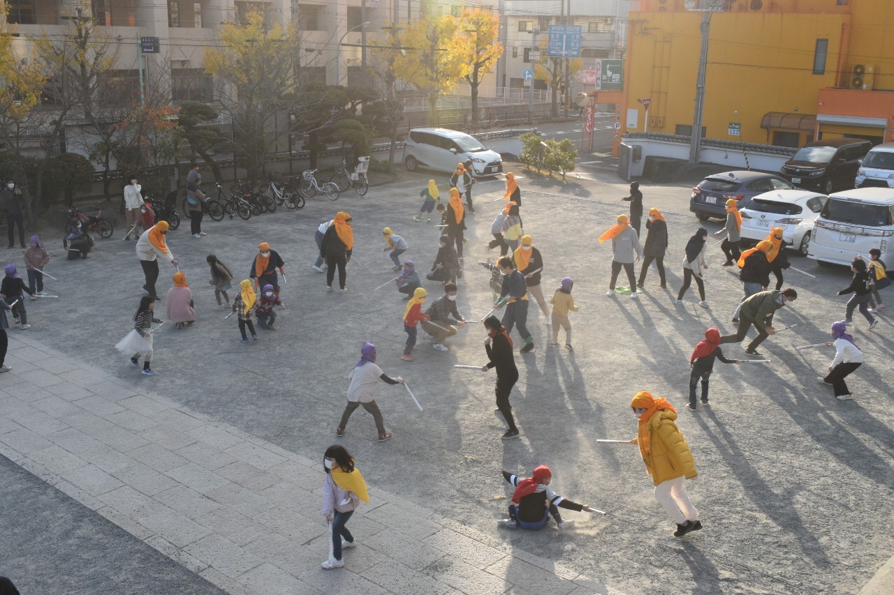 第2弾として、12月10日(土)にスタッフ対象のワークショップ「まちを遊ぶってなんだ!?」、12月11日(日)に「紀州忍者参上!集まれ!紀の国っ子忍者達!」を開催しました。10日のワークショップでは、参加者全員が一緒に身体を動かして遊びました。笑顔溢れる空間に変わり、最後にはみんな仲良くなり和んだ一日でした。11日の本番当日は、市内の小学生(1年生〜4年生)50名が参加。風呂敷を頭に巻いて忍者になると、早速鷺森別院本堂で忍者修行がスタート。チームに分かれ、大学生・地域ボランティアの方々と共に、1年生は鷺森別院近辺のお寺・神社を、2年生〜4年生は和歌山市駅前周辺のお店・孫市城を、地図やヒントを手掛かりに訪ねます。合言葉が合うと、その人が忍者道場主!見事正体を見破ったら、道場主が「印」を授けてくれます。神社やお寺、お店の人や地域の人とのやり取りや関わり合いの中で、子どもたちの目が輝き、いきいきとした表情がみられました。修行のあと、鷺森別院の境内で、大人対子どもの旗取りチャンバラ合戦を行いました。新聞紙の剣を使っての真剣勝負は、子ども2勝、大人1勝で、見事子どもチームの勝利!子どもたちは大喜び、大人たちは悔しそう。最後に、アフタフバーバンの忍者から、紀州っ子忍者の証として、巻物が授与されました。まちを舞台に、大人も子どもも一緒になって忍者遊びを楽しみ、心を通わせあい、みんなが笑顔になる、そんな素敵な一日となりました。