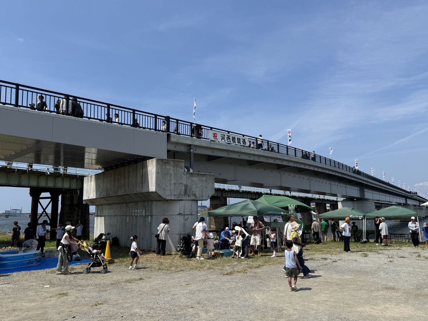 8月17日(日)に、河西橋開通記念イベント「橋を渡ってシエキノカワで遊ぼう!」を開催しました。新しい河西橋の開通を記念し、同日に野崎地区側で開催された和歌山市主催の記念式典に合わせて、河西橋東詰(市駅側)付近の紀の川河川敷を会場に、これまでの橋の歴史を振り返りながら、新たな橋の開通を祝い、BBQやさまざまな体験コンテンツ等を楽しんでいただきました。