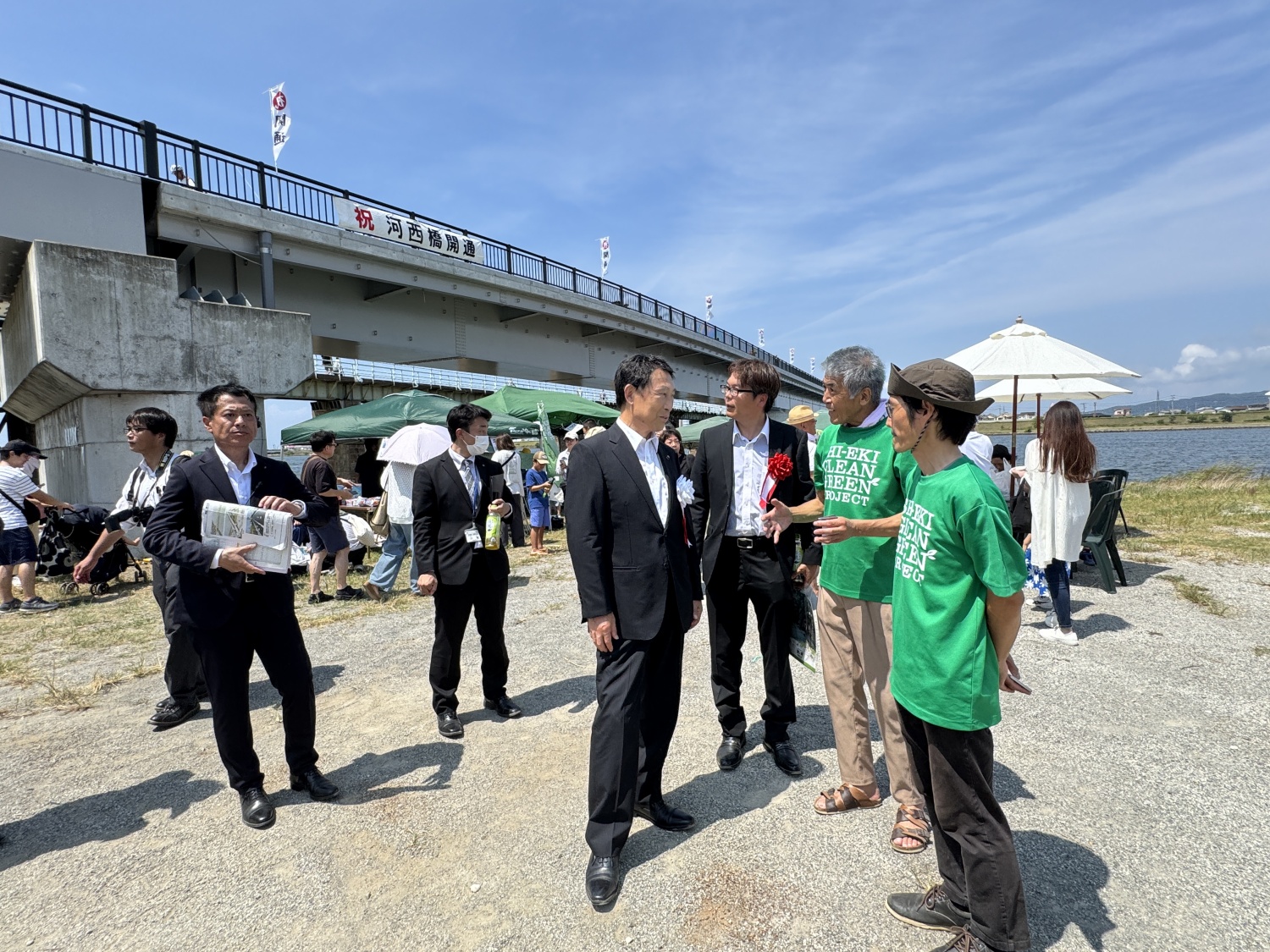 対岸での記念式典終了後には、新しい河西橋の渡り初めが行われ、野崎地区側からも多くの方々にご来場いただいたほか、和歌山市の尾花市長、国土交通省近畿地方整備局の齋藤局長にも足を運んでいただくことができました。