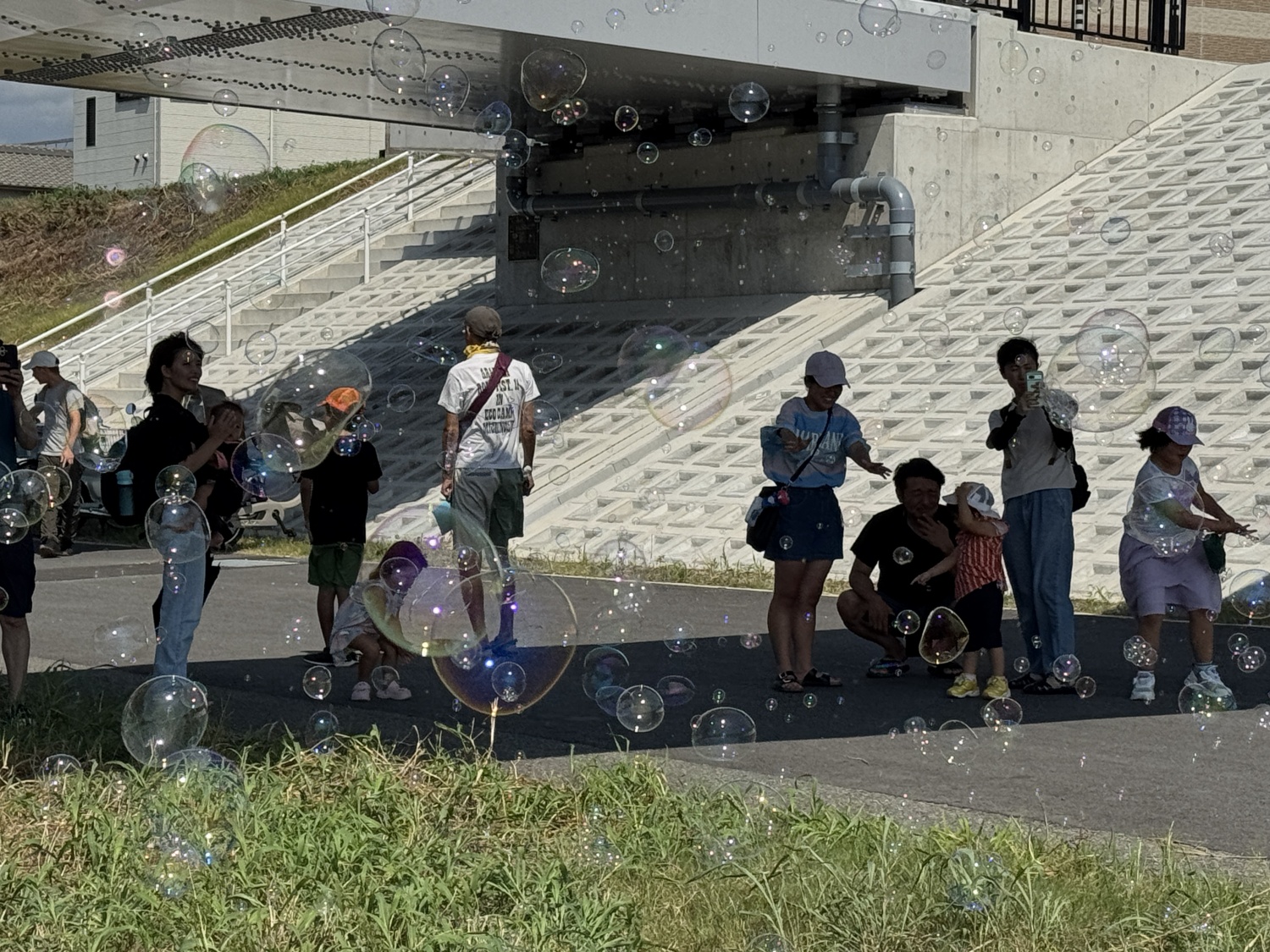 会場内では、事前予約制のBBQや、キッチンカー等による飲食物の販売、紀の川の歴史や河川改修に関するパネル展示を行ったほか、遊び体験として、モルックやコーンホール、プールでの水遊び、輪投げやスーパーボールすくい、千本釣り、さらに冒険シャボン玉研究所の協力による巨大シャボン玉のパフォーマンスと遊び体験も行いました。
