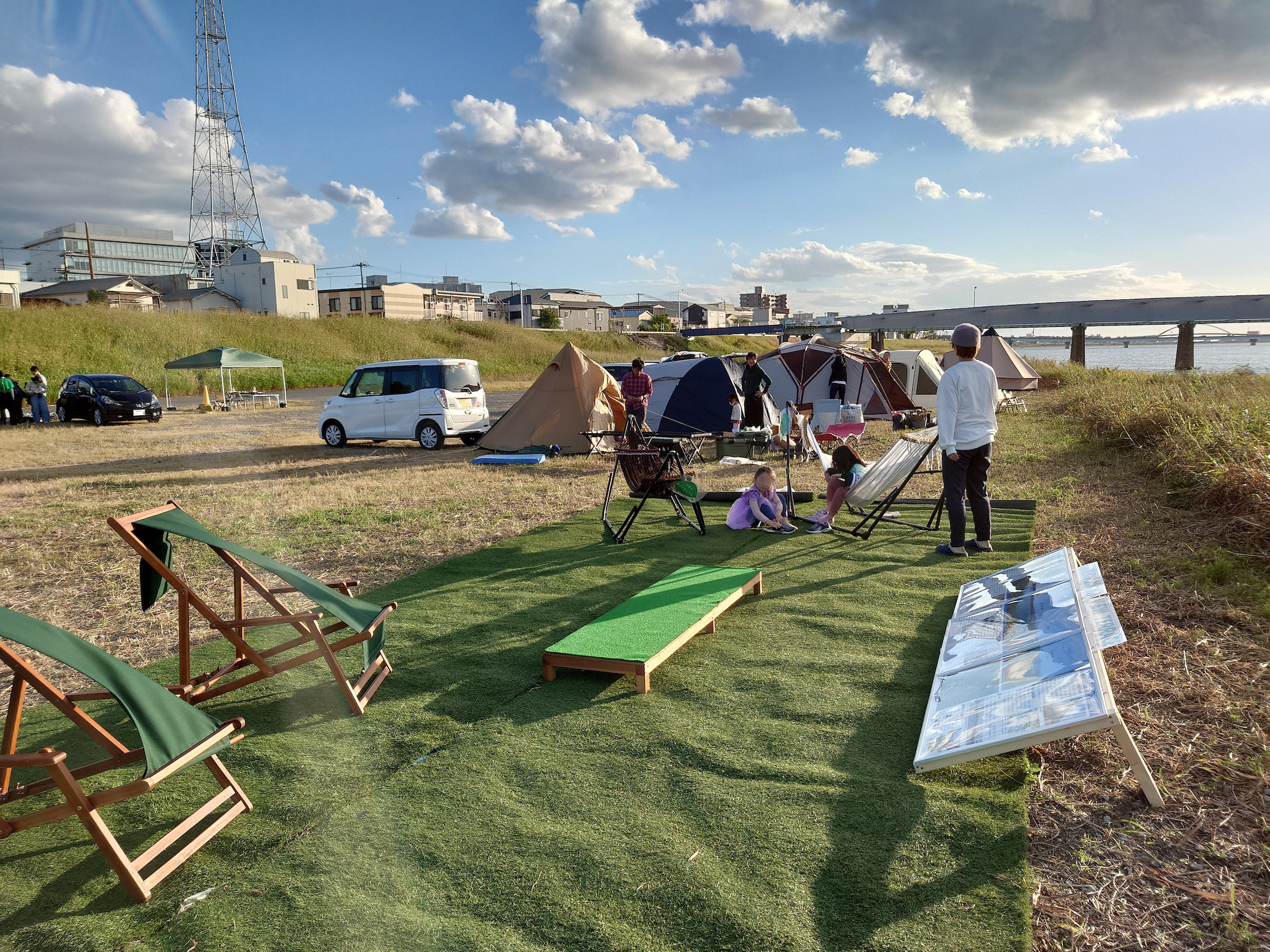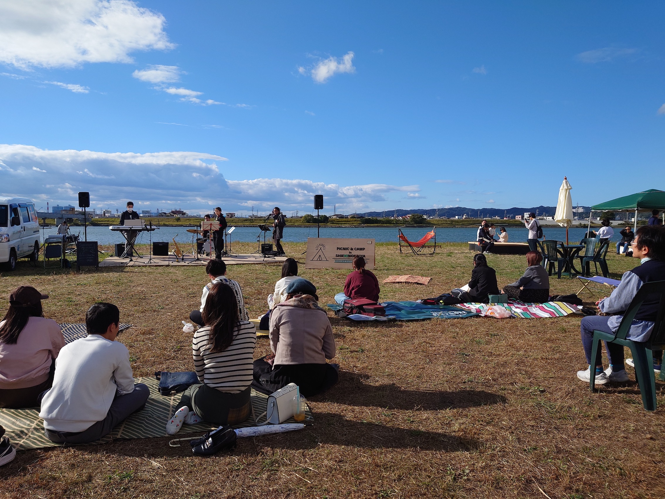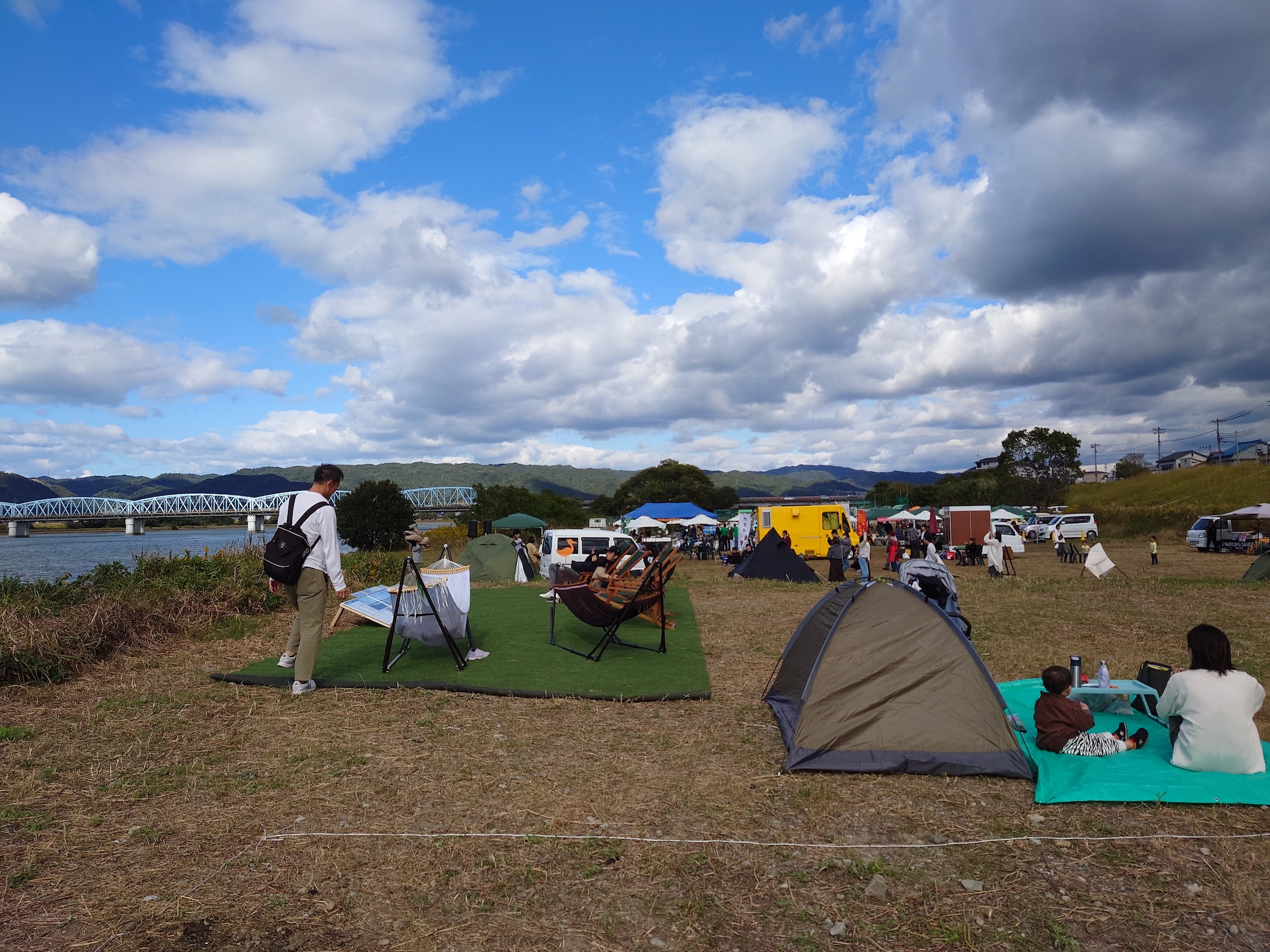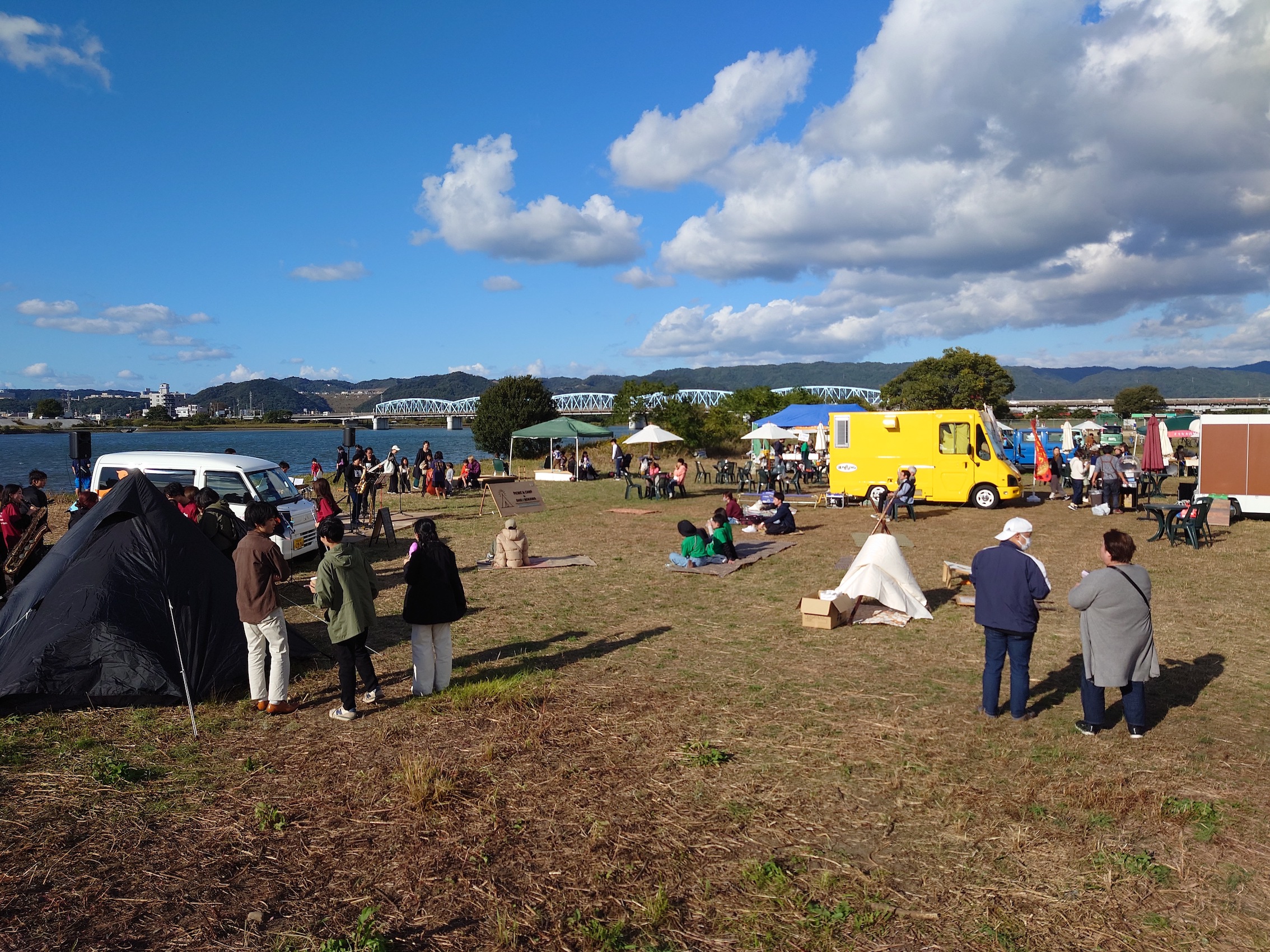 今年も10月29日(日)に、和歌山市駅から徒歩7分の紀の川河川敷「シエキノカワひろば」にて、紀の川の魅力を体感する社会実験「シエキノカワでピクニック&キャンプ」を実施しました。6年目となる今回も、紀の川を眺められる芝生広場を中心に、ハンモックや畳ベンチなどを設置したくつろぎスペース(水辺の縁側、眺望テラス)を設け、カヌー体験やBBQ体験、キッチンカー等の出店者が並ぶフードエリア、和歌山大学の演奏団体による音楽ステージ、コーンホール体験や紙芝居・シャボン玉など親子で楽しめるアクティビティも提供しました。また、昨年に引き続き、前日から芝生広場の隣接地にてキャンプ(宿泊体験)を実施したほか、今年は国による紀の川直轄改修事業の開始から100周年を迎えることを記念した特別企画として、災害時に活躍する国土交通省と自衛隊の特殊車両等の展示・乗車体験(自衛隊メガクルーザー)も実施しました。