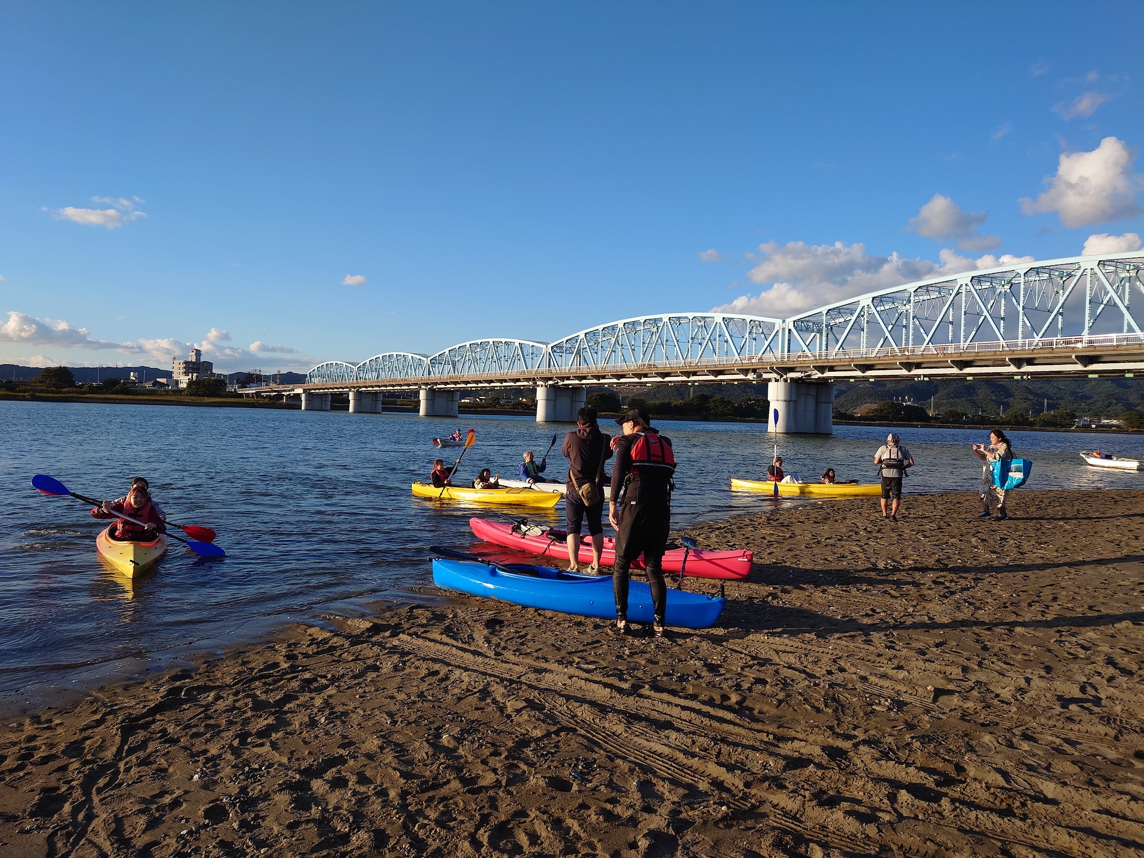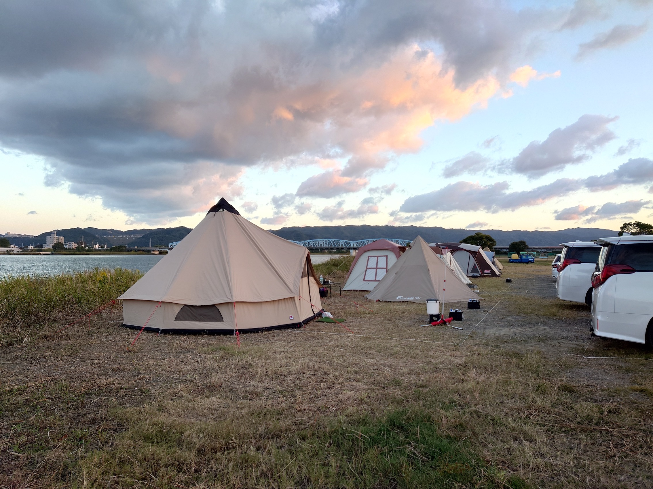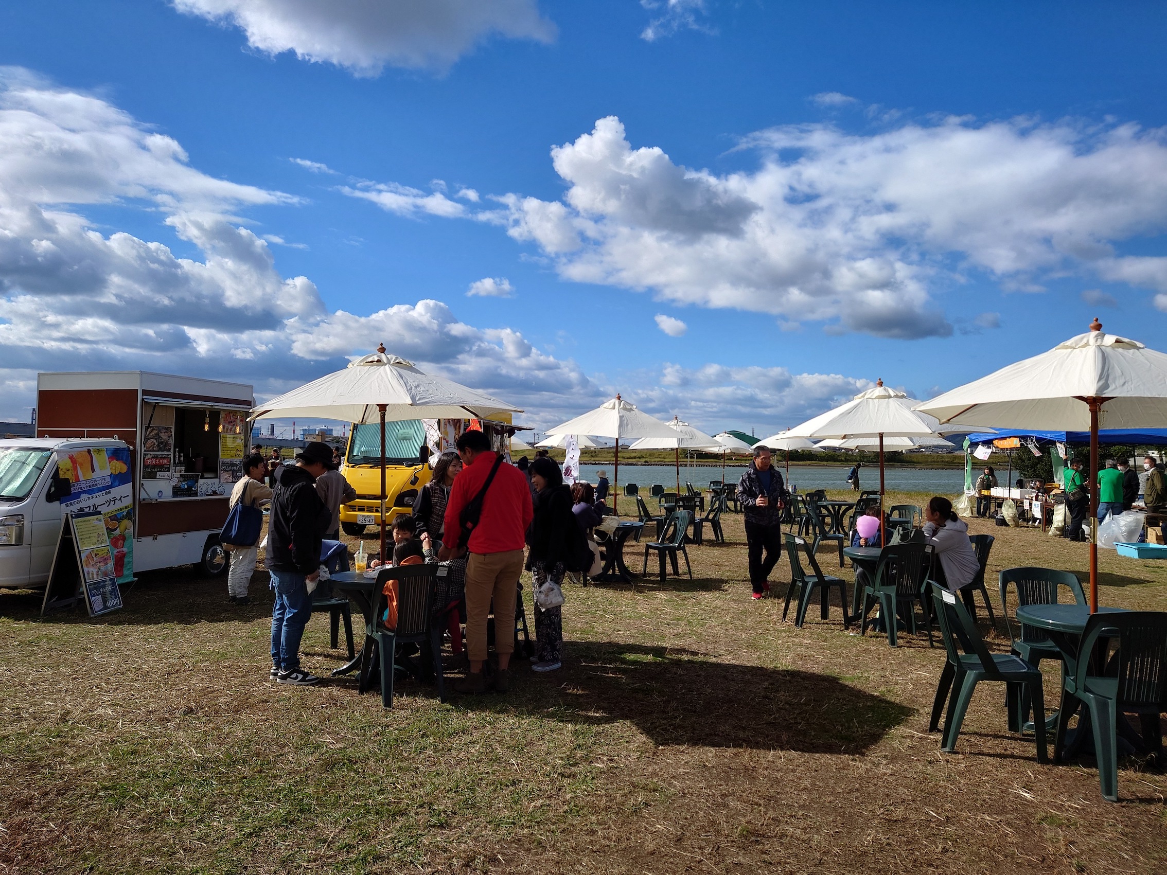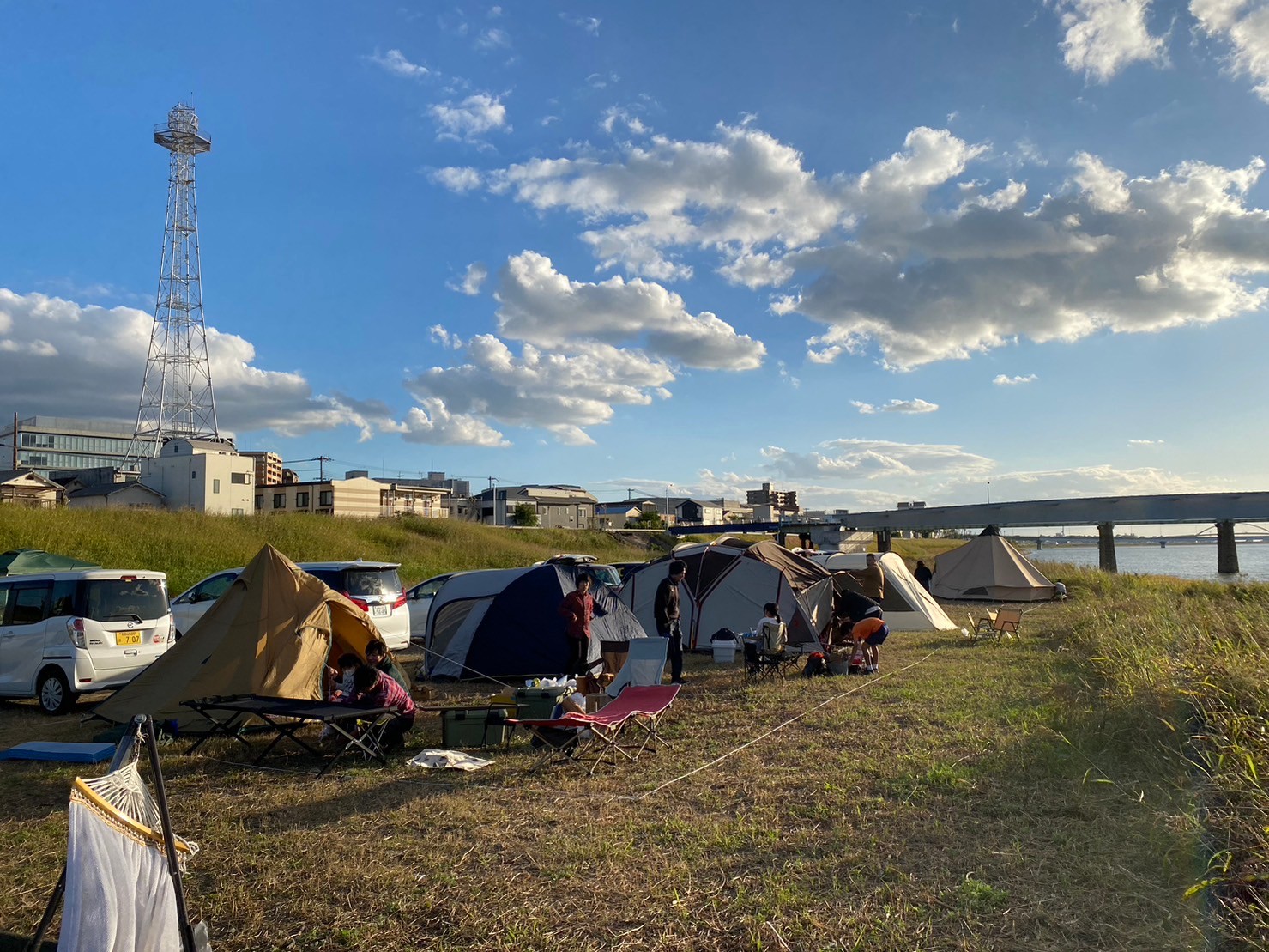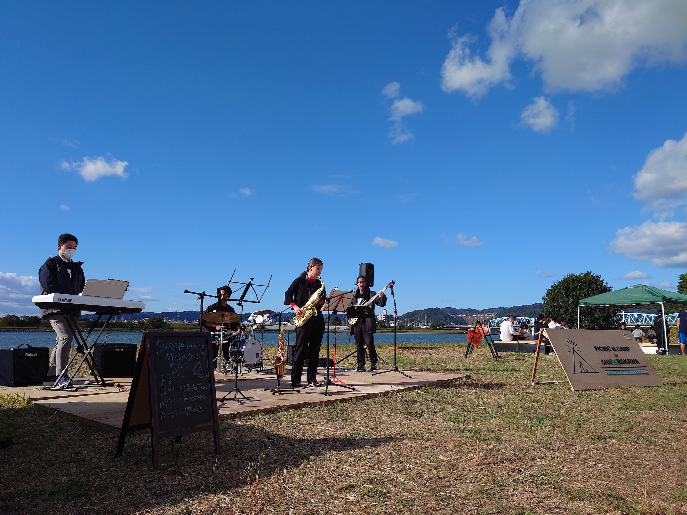 今年も10月29日(日)に、和歌山市駅から徒歩7分の紀の川河川敷「シエキノカワひろば」にて、紀の川の魅力を体感する社会実験「シエキノカワでピクニック&キャンプ」を実施しました。6年目となる今回も、紀の川を眺められる芝生広場を中心に、ハンモックや畳ベンチなどを設置したくつろぎスペース(水辺の縁側、眺望テラス)を設け、カヌー体験やBBQ体験、キッチンカー等の出店者が並ぶフードエリア、和歌山大学の演奏団体による音楽ステージ、コーンホール体験や紙芝居・シャボン玉など親子で楽しめるアクティビティも提供しました。また、昨年に引き続き、前日から芝生広場の隣接地にてキャンプ(宿泊体験)を実施したほか、今年は国による紀の川直轄改修事業の開始から100周年を迎えることを記念した特別企画として、災害時に活躍する国土交通省と自衛隊の特殊車両等の展示・乗車体験(自衛隊メガクルーザー)も実施しました。