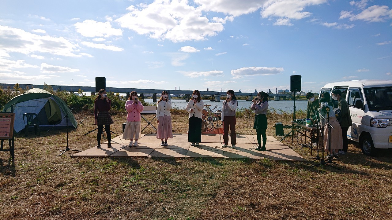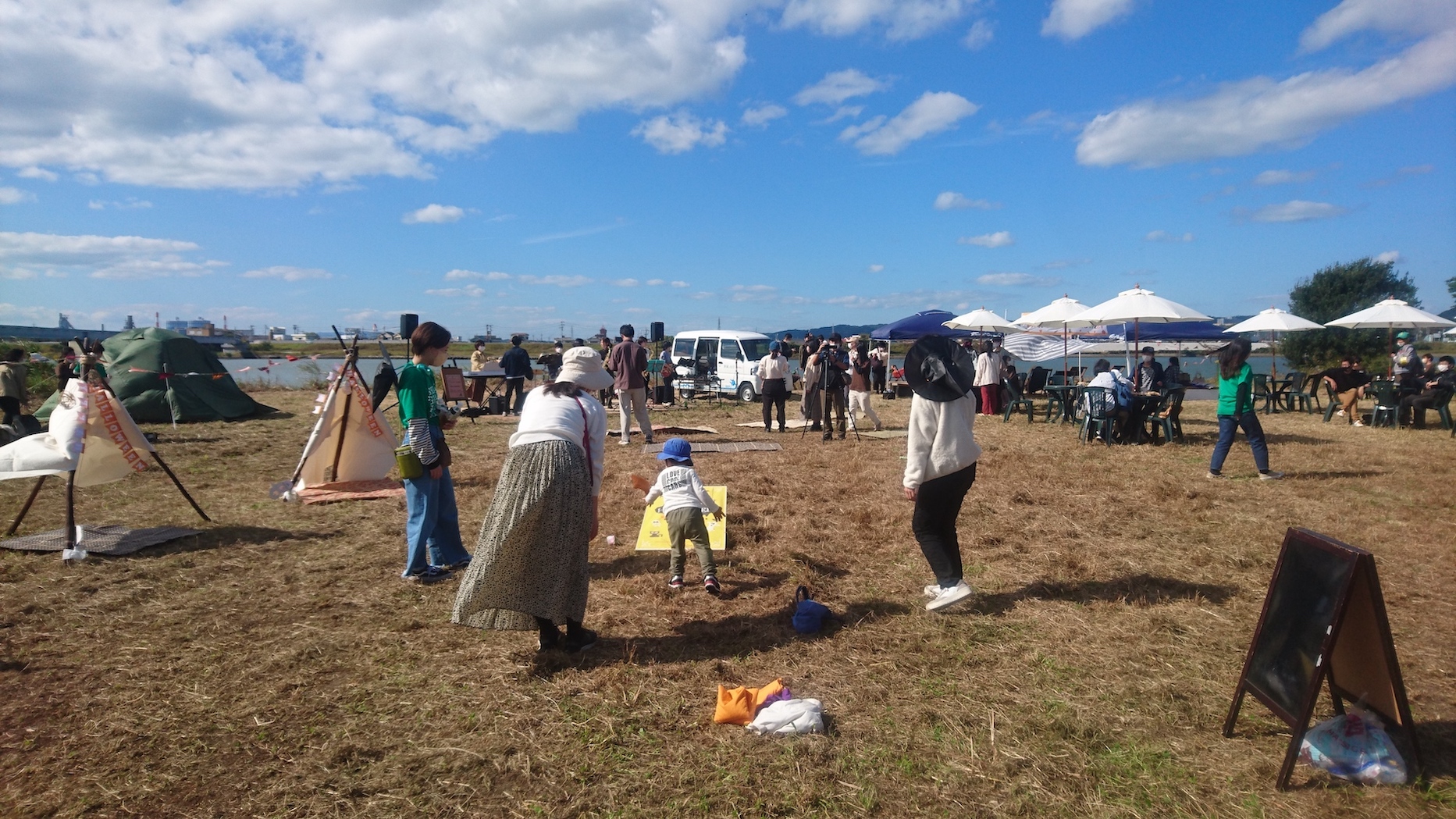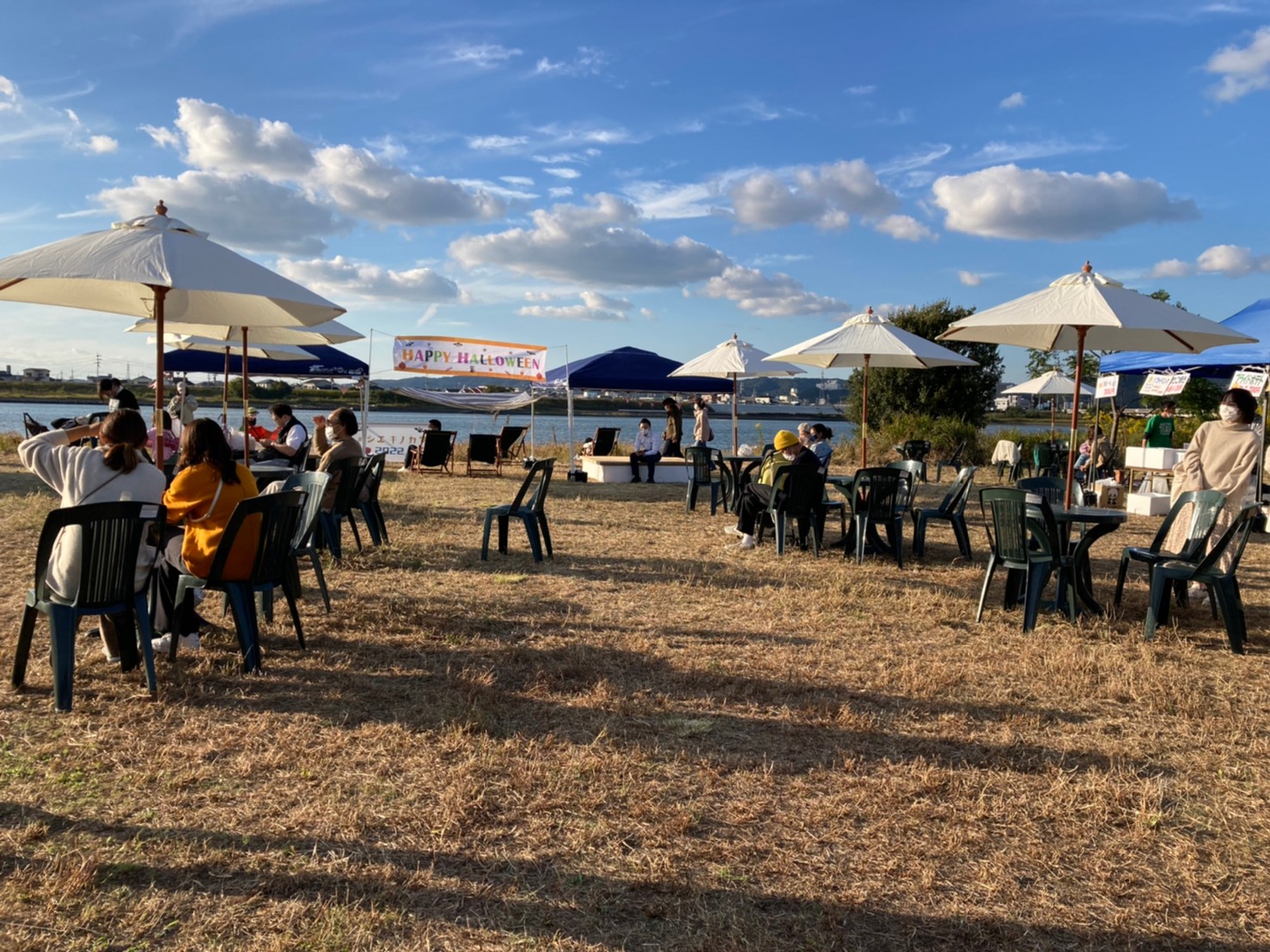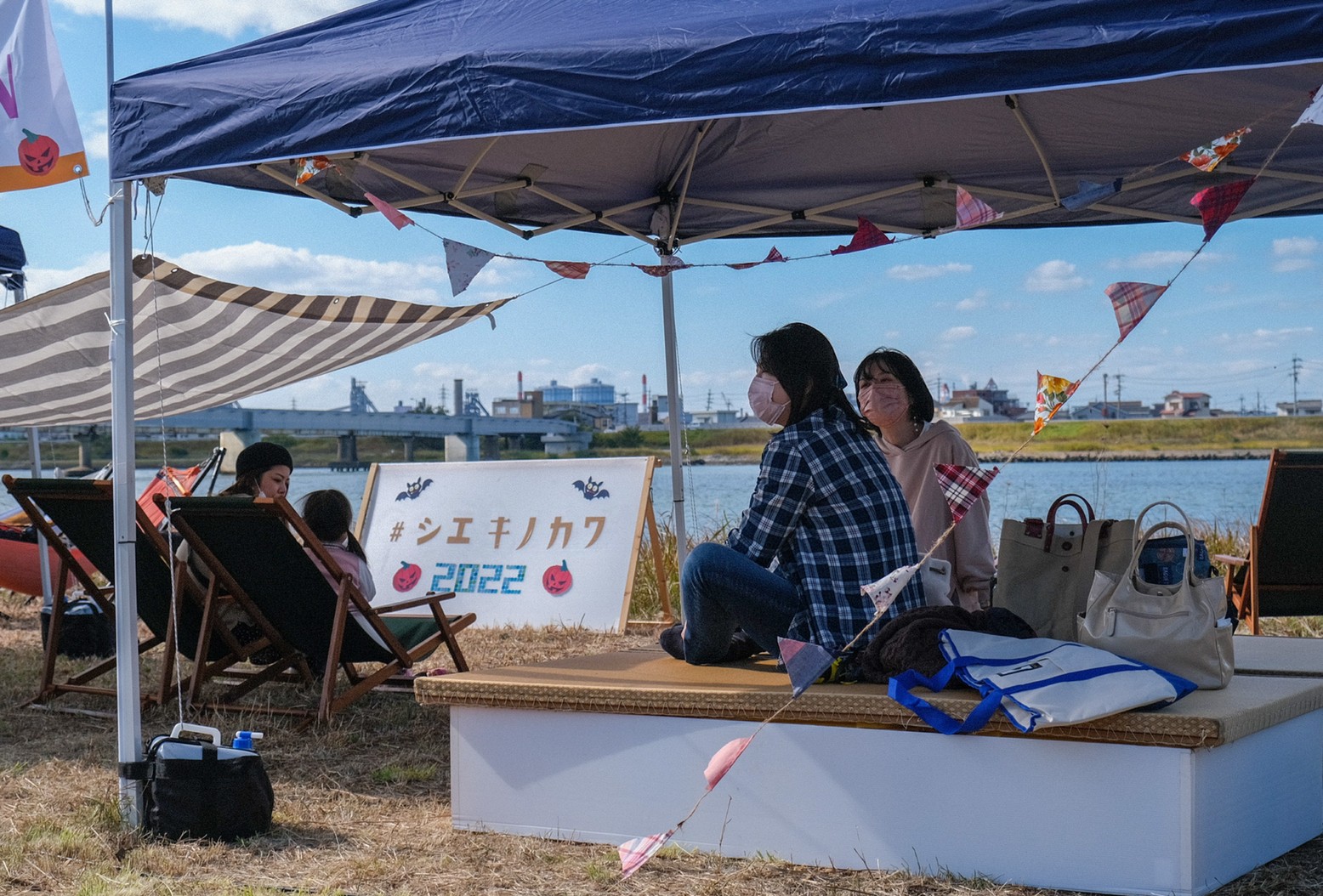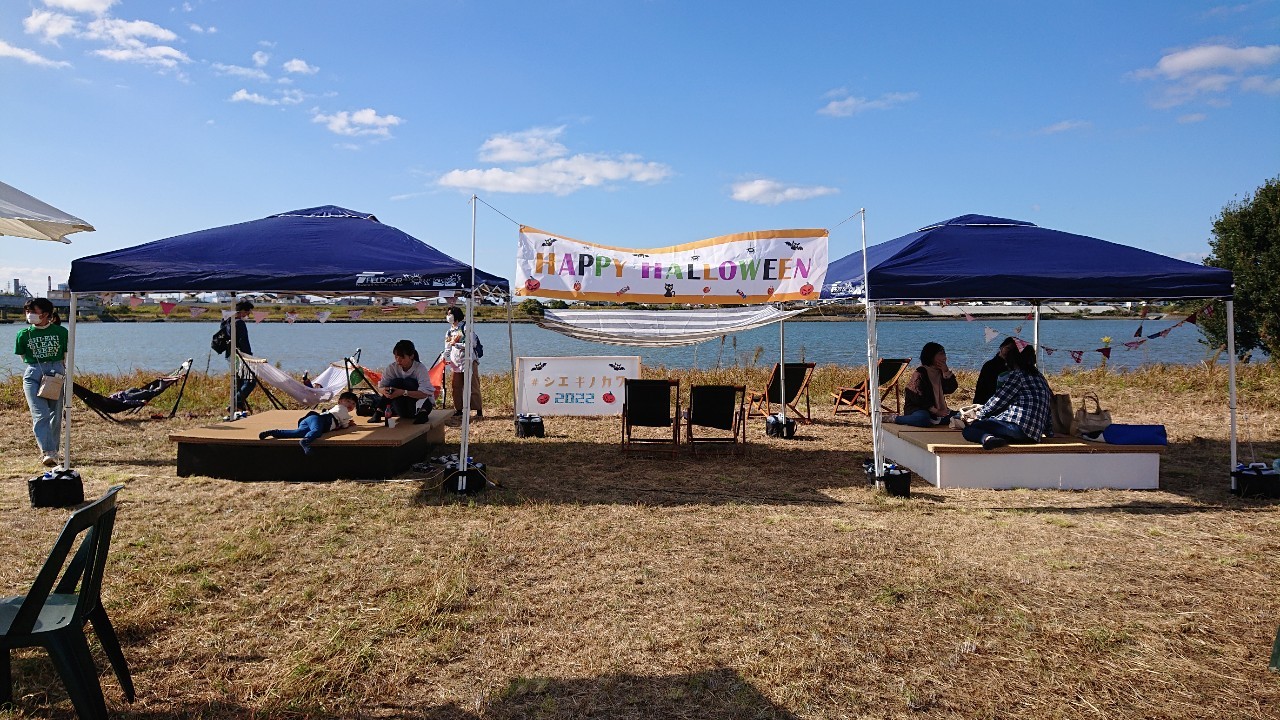 今年も10月29日(土)に、和歌山市駅から徒歩7分の紀の川河川敷「シエキノカワひろば」にて、紀の川の魅力を体感する社会実験「夕暮れのシエキノカワでピクニック&キャンプ」を実施しました。5年目となる今回は、新たにモニター参加者向けの1泊2日のキャンプ(宿泊体験)も企画に盛り込んだほか、日中のピクニックでは、例年のように畳ベンチやハンモックなどを設置したくつろぎスペース「水辺の縁側」のほか、事前予約制のBBQスペース、飲食物、農産物や特産品の販売ブースを設け、また体験型のアクティビティとして、恒例のカヌー体験(事前予約で満席となりました)、アメリカ発祥のパーティーゲーム「コーンホール」体験、小さなお子さまも楽しめるシャボン玉や紙芝居、夕暮れには手持ち花火を行いました。また今回は3年ぶりに音楽ステージを復活させ、紀の川の水面を背景に和歌山大学の学生団体によるアカペラ・吹奏楽・ジャズの演奏も繰り広げられ、穏やかな午後から夕暮れのピクニックのひと時に彩りを添えました。