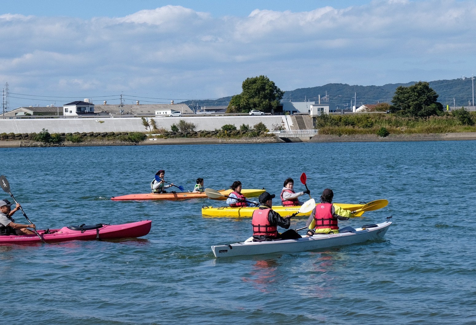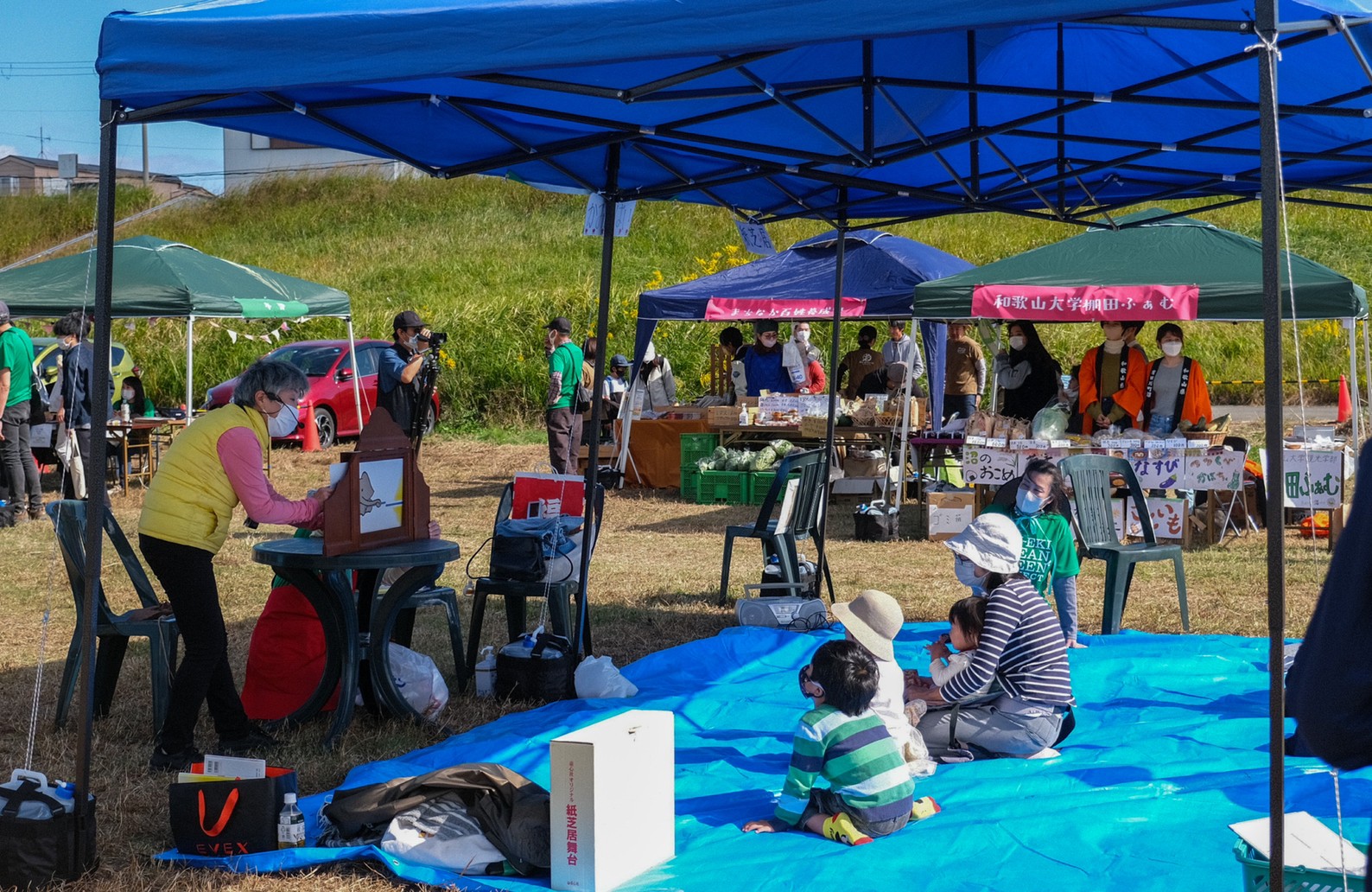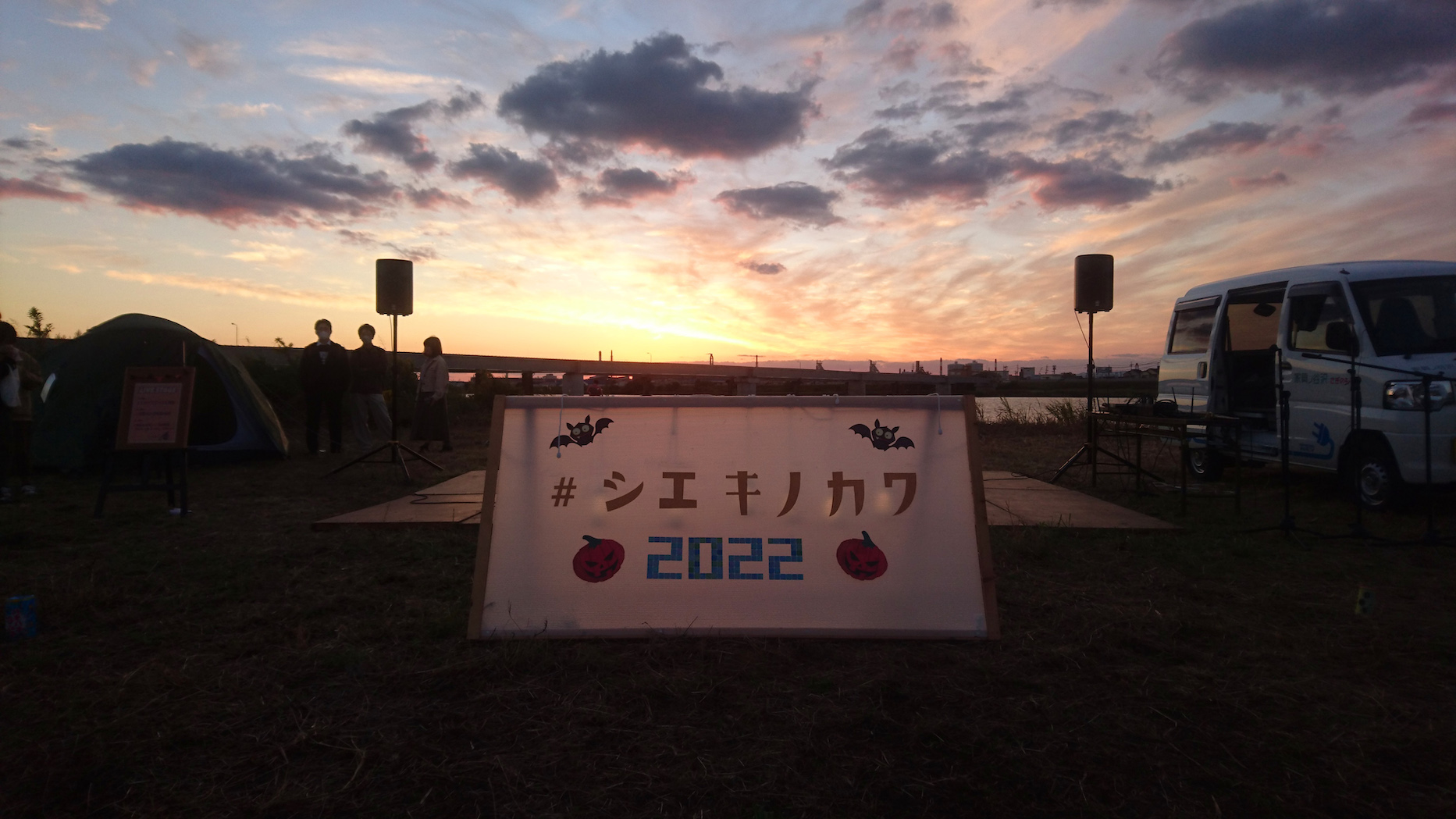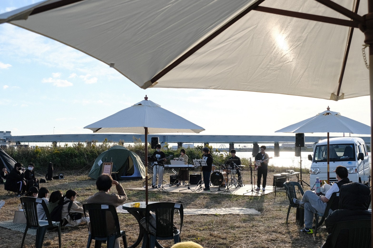 今年も10月29日(土)に、和歌山市駅から徒歩7分の紀の川河川敷「シエキノカワひろば」にて、紀の川の魅力を体感する社会実験「夕暮れのシエキノカワでピクニック&キャンプ」を実施しました。5年目となる今回は、新たにモニター参加者向けの1泊2日のキャンプ(宿泊体験)も企画に盛り込んだほか、日中のピクニックでは、例年のように畳ベンチやハンモックなどを設置したくつろぎスペース「水辺の縁側」のほか、事前予約制のBBQスペース、飲食物、農産物や特産品の販売ブースを設け、また体験型のアクティビティとして、恒例のカヌー体験(事前予約で満席となりました)、アメリカ発祥のパーティーゲーム「コーンホール」体験、小さなお子さまも楽しめるシャボン玉や紙芝居、夕暮れには手持ち花火を行いました。また今回は3年ぶりに音楽ステージを復活させ、紀の川の水面を背景に和歌山大学の学生団体によるアカペラ・吹奏楽・ジャズの演奏も繰り広げられ、穏やかな午後から夕暮れのピクニックのひと時に彩りを添えました。