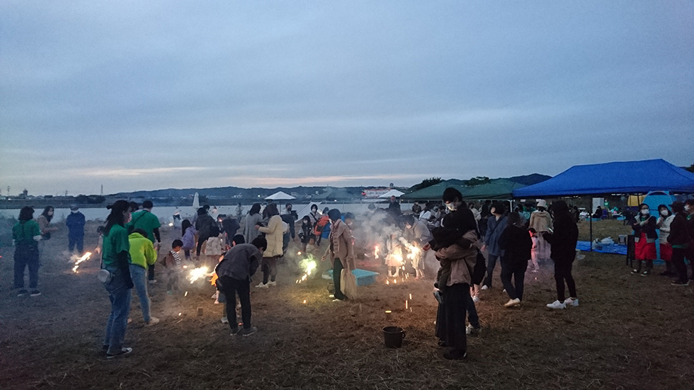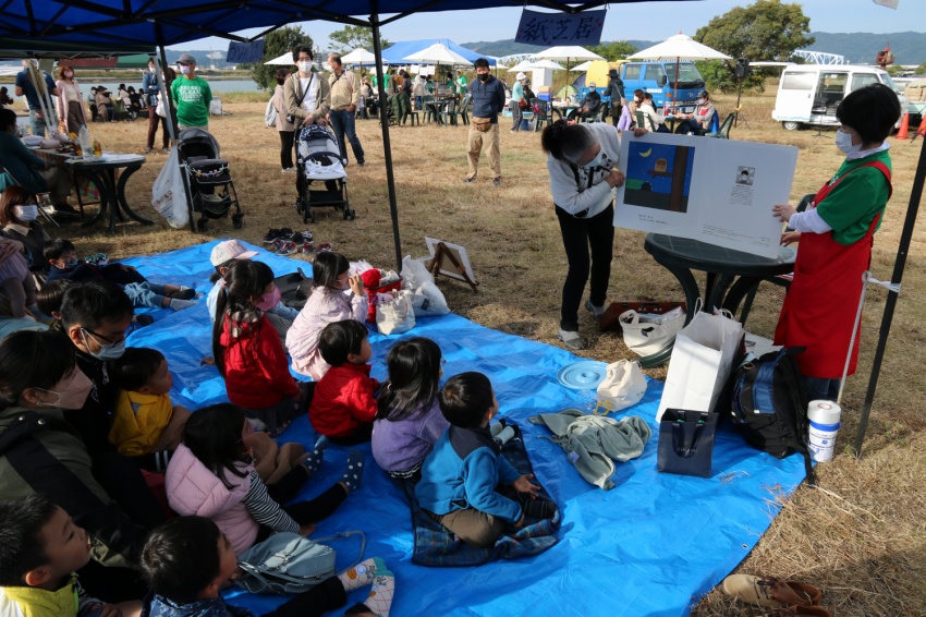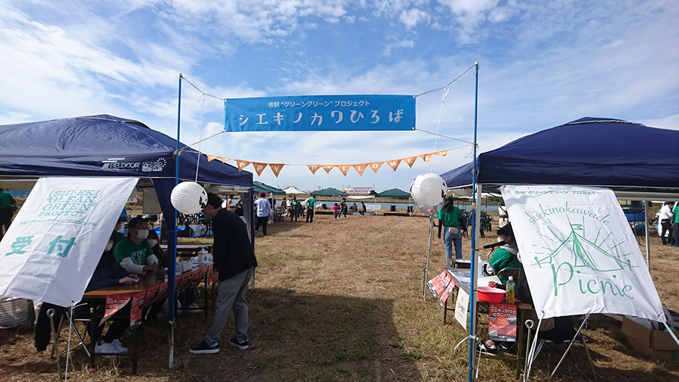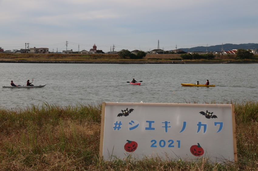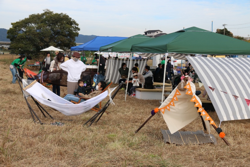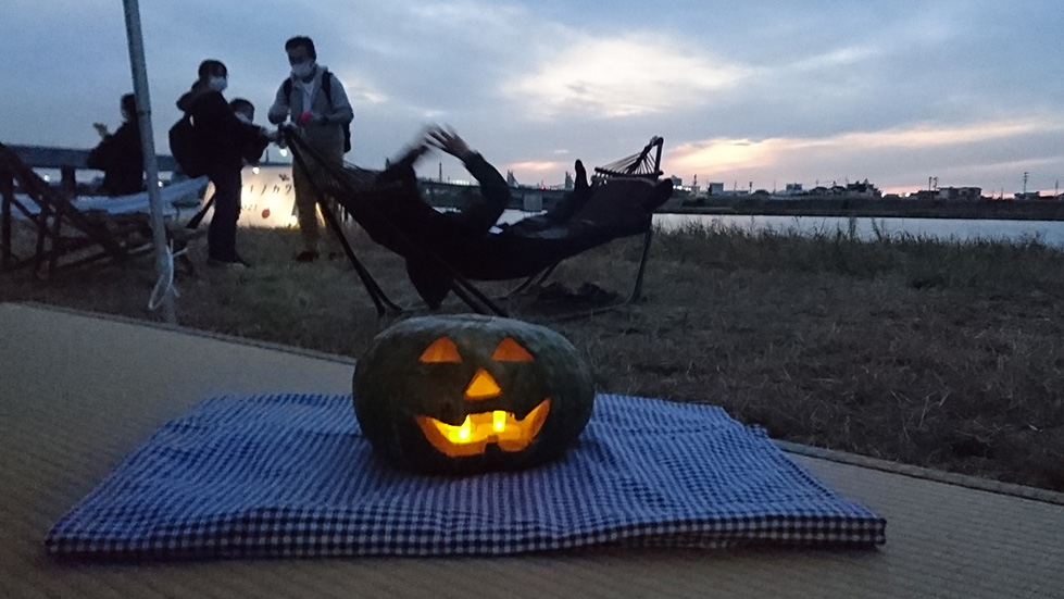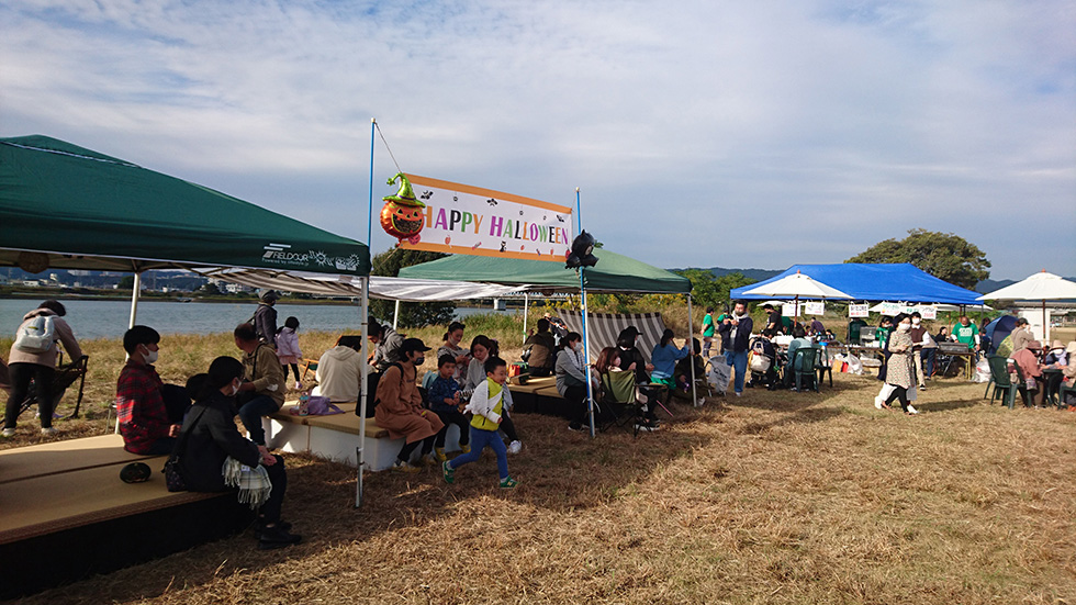 今年も10月24日(日)に、和歌山市駅から徒歩7分の紀の川第5緑地に設けた「シエキノカワひろば」にて、紀の川の魅力を体感する社会実験を実施しました。秋の河川敷での社会実験は4回目となりますが、今回も入口での検温・消毒などの感染症対策を実施しながら、畳ベンチやハンモックなどを設置したくつろぎスペース「水辺の縁側」のほか、事前予約制のBBQスペースや飲食物・物産販売ブースを設け、また体験型のアクティビティとして、恒例のカヌー体験に加え、アメリカ発祥のパーティーゲーム「コーンホール」体験、小さなお子さまも楽しめるシャボン玉や紙芝居、夕暮れには手持ち花火を行いました。今回はハロウィンの会場演出も行い、ご家族連れを中心に、秋のシエキノカワでのんびりと過ごしていただくことができました。コロナ禍での2年目の実施となり、今回も水辺の憩いの場づくりをメインに企画しましたが、来場者数は昨年を上まわる延べ380人でした。市駅から歩いて行ける身近な河川敷の楽しみ方を、これからも発信していきたいと思います。ご来場いただいた皆様ありがとうございました。
